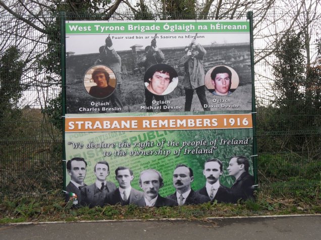 “Strabane remembers them forever” – the dead of the “unfinished revolution, unfinished business” of the 1916 Easter Rising. The central image on the large tarp is a modified version of the 1941 stamp designed by Victor Brown showing an armed volunteer outside the GPO (stampboards).