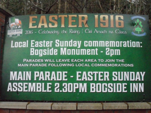 The flag of the “Irish Republic” – the kind that was flown over over the GPO during the Easter Rising/Éırí Amach Na Cásca in 1916 – flies over Free Derry Corner (Visual History) ahead of the Rising’s centenary in 2016. The posters were added a few days later, announcing a commemoration on Monday the 28th; the parade advertised on the rear of Free Derry Corner is on the 27th, which is also the date of the march in Coalisland.