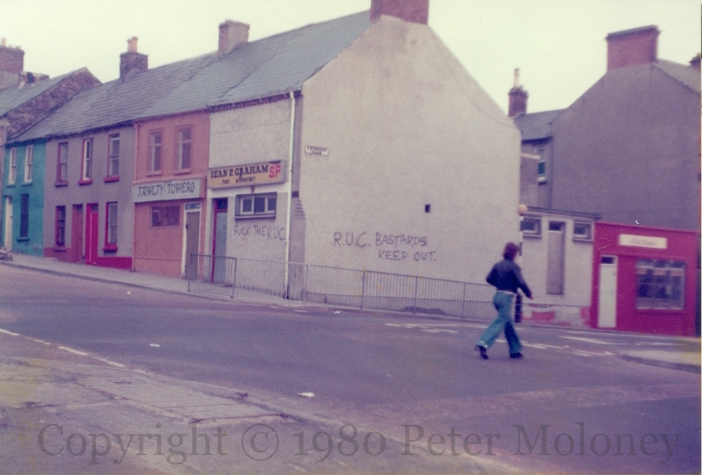 RUC Bastards Keep Out 1980-01-052025-01-30Extramural Activity “RUC bastards keep out”, “Fuck the RUC”, (and an establishment called “Fawlty Towers”!) Bishop Street, Derry Click image to enlargeCopyright © 1980 Peter MoloneyM00372 Share this: Share on X (Opens in new window) X Share on Facebook (Opens in new window) Facebook Like Loading... Related