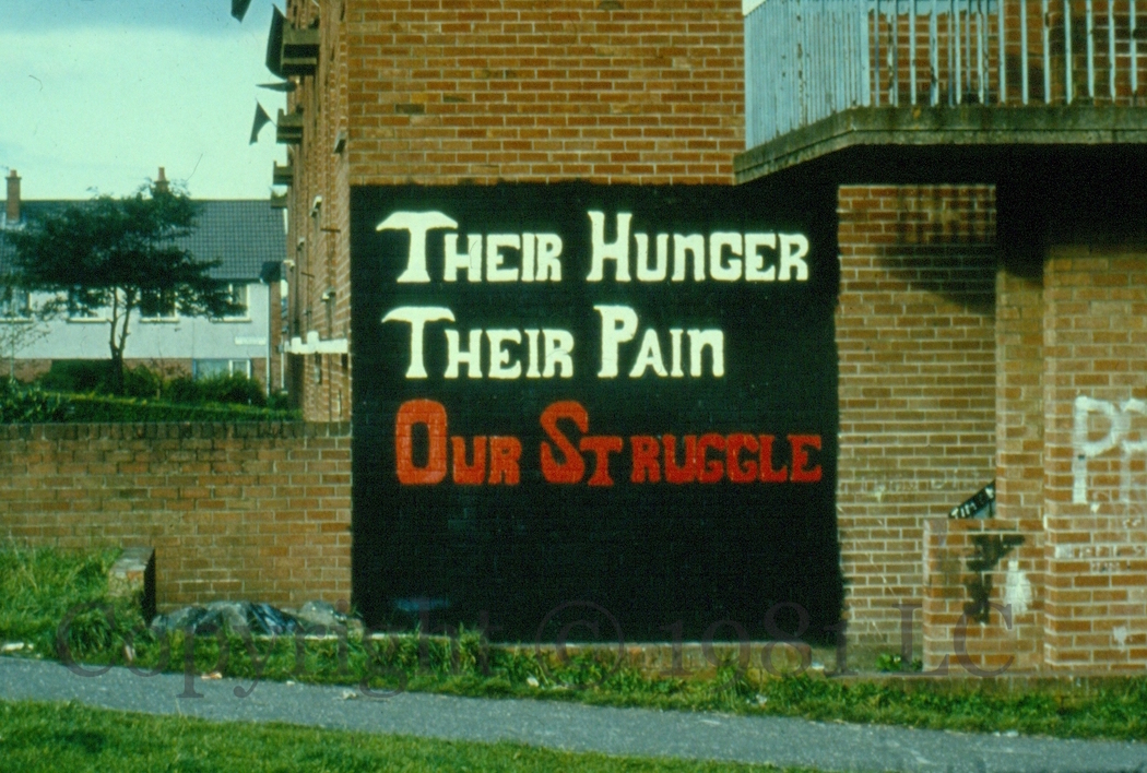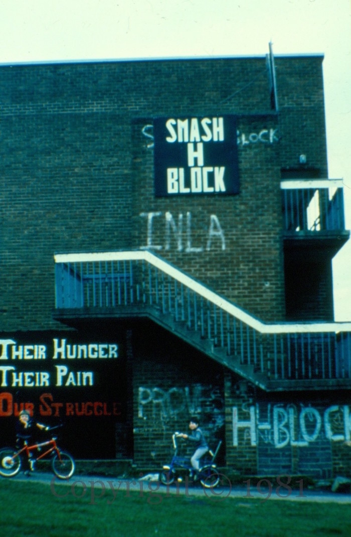 “Smash H Block”, “INLA”, “H-Block”, “Provies”. Carefully-done lettering is a development from simple graffiti and a pre-cursor to the murals of 1981 – see Visual History 03.