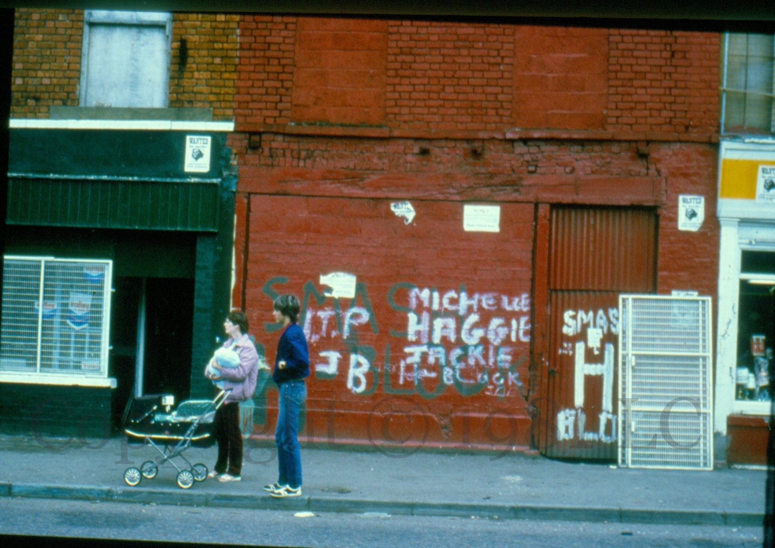 Falls Road (between Lower Clonard Street and Waterford Street; next to Harden’s shop), west Belfast.