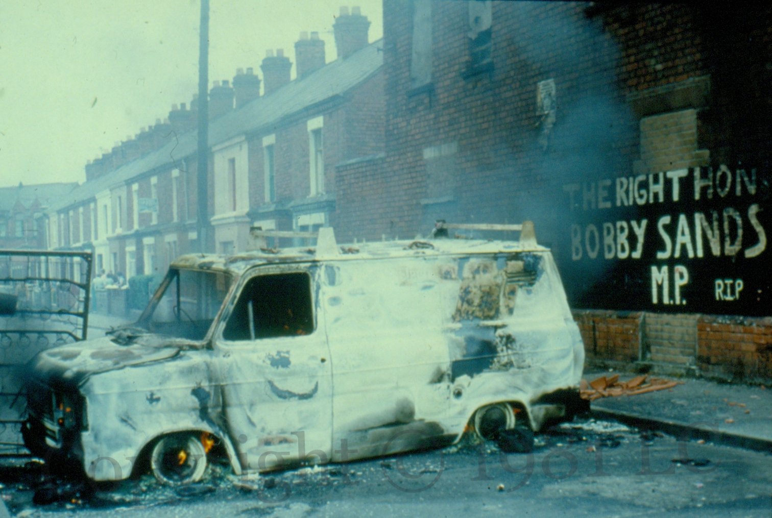 The Right Hon. Bobby Sands 1981-01-252025-01-30Extramural Activity “The Right Honourable Bobby Sands M.P. RIP” in front of a burning van in Islandbawn Street, west Belfast. Click image to enlargeCopyright © 1981 LCM00045 M00053 Share this: Click to share on X (Opens in new window) X Click to share on Facebook (Opens in new window) Facebook Like Loading... Related