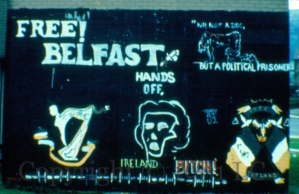 “Hands off Ireland, bitch”, with a line drawing of Margaret Thatcher; “No, not a dog, but a political prisoner” with a prisoner on all fours. Also a harp in green, white, and gold, and a phoenix with Tricolours, and a hand clasping a dagger.