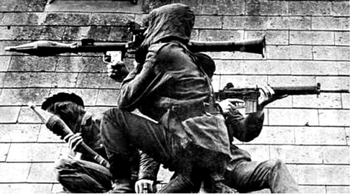 “Victory [to the] IRA”. Volunteers with RPGs and armalites on Shaws Road, Belfast, kneeling over an outline of Ireland in green, white, and gold. The original (unattributed) photograph is below.