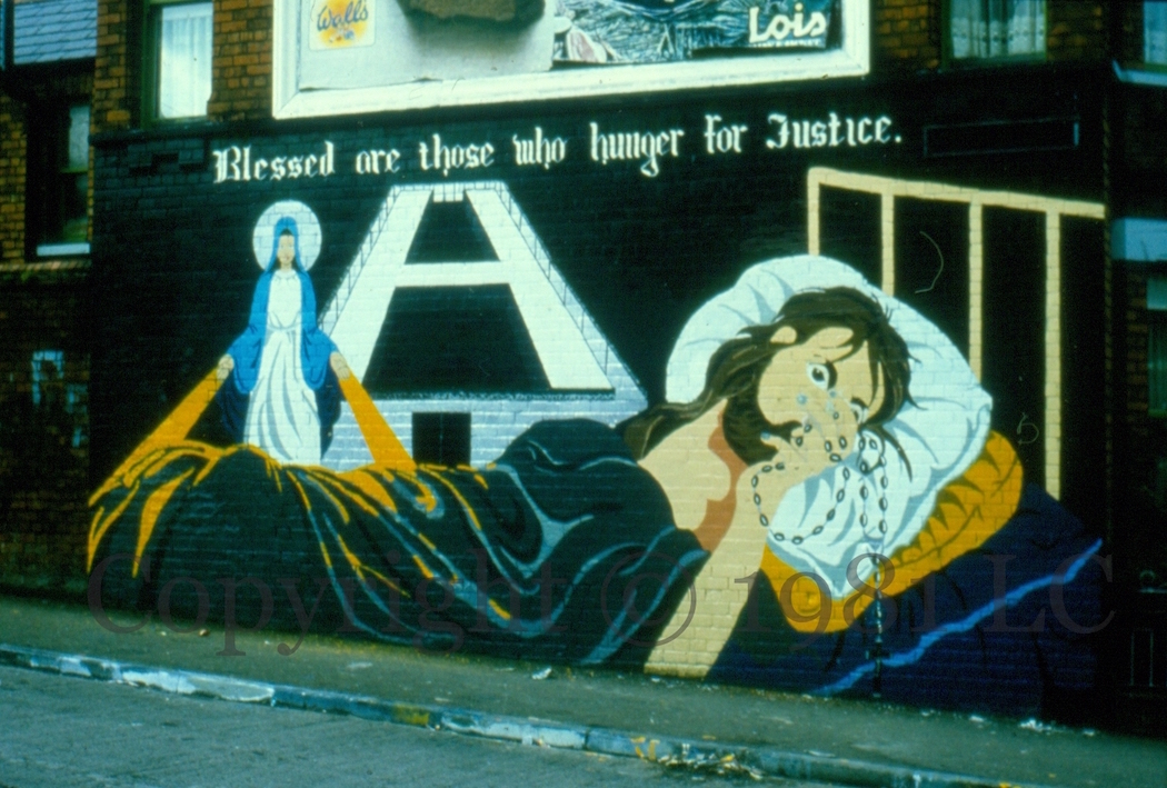 (Painted by Con, who describes the mural as an attempt to break through with nationalists (as distinct from republicans), though one source says “by a Ballymurphy man, named something like Tim Skillen/Skelly”.)