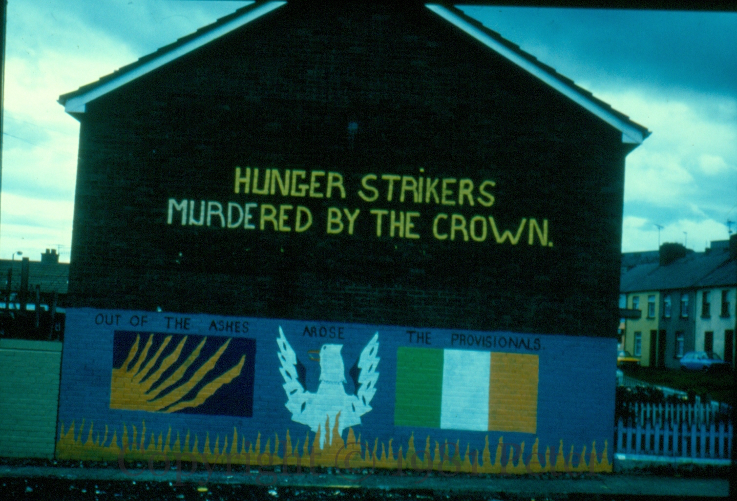 Murdered By The Crown 1981-03-182025-01-31Extramural Activity “Hunger strikers murdered by the crown”, “Out of the ashes arose the Provisionals”, with a primitive phoenix, sunburst flag, and tricolour. Blucher Street/Lisfannon Park, Bogside, Derry Click image to enlargeCopyright © 1981 Peter MoloneyM00182 Share this: Click to share on X (Opens in new window) X Click to share on Facebook (Opens in new window) Facebook Like Loading... Related