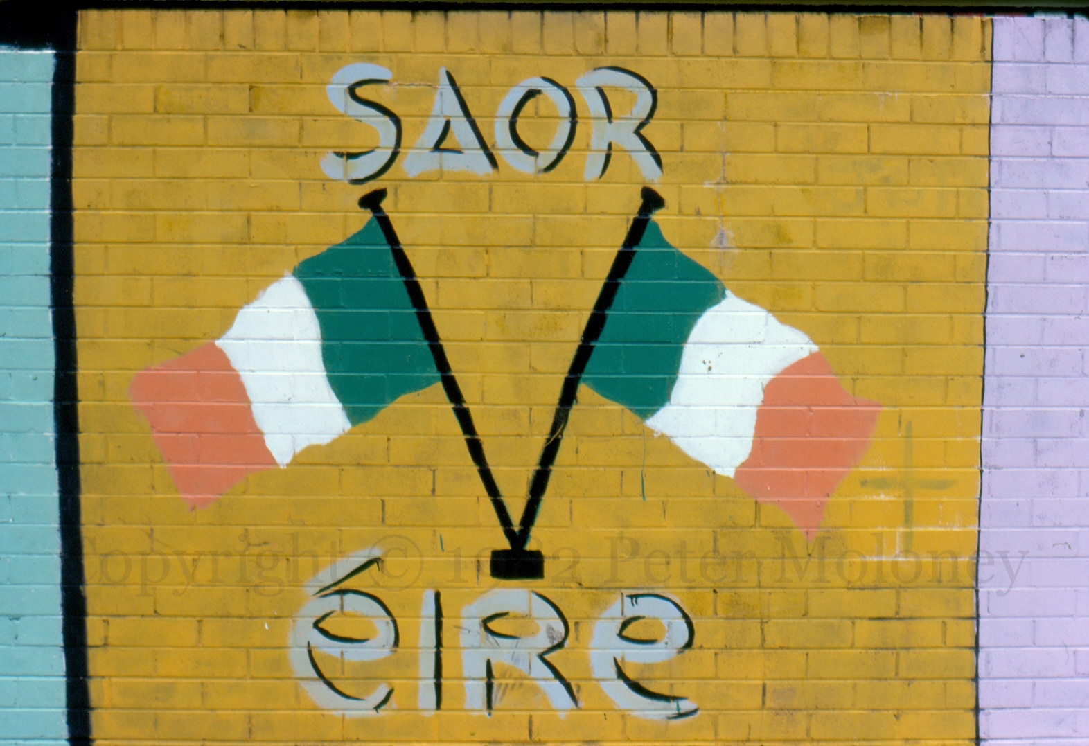 Saor Éıre 1982-01-182025-01-31Extramural Activity A stand of two tricolours and “saor éıre” — Irish for “Free Ireland”. Bishop Street, Derry Click image to enlargeCopyright © 1982 Peter MoloneyM00142 Share this: Share on X (Opens in new window) X Share on Facebook (Opens in new window) Facebook Like Loading... Related