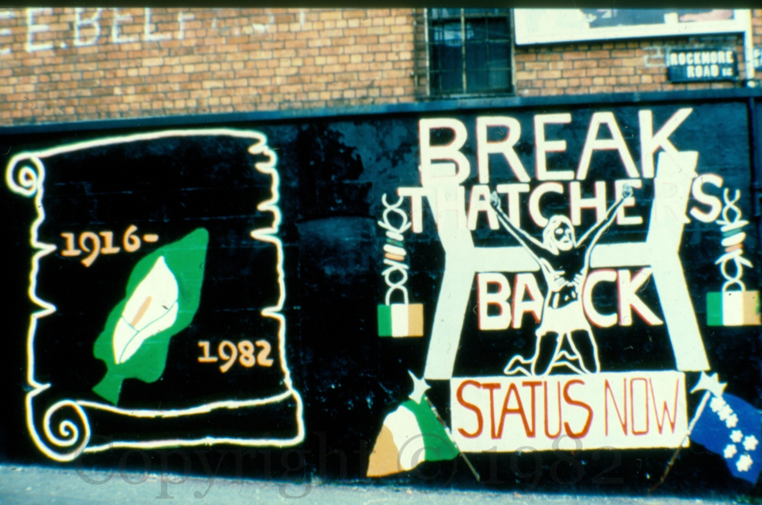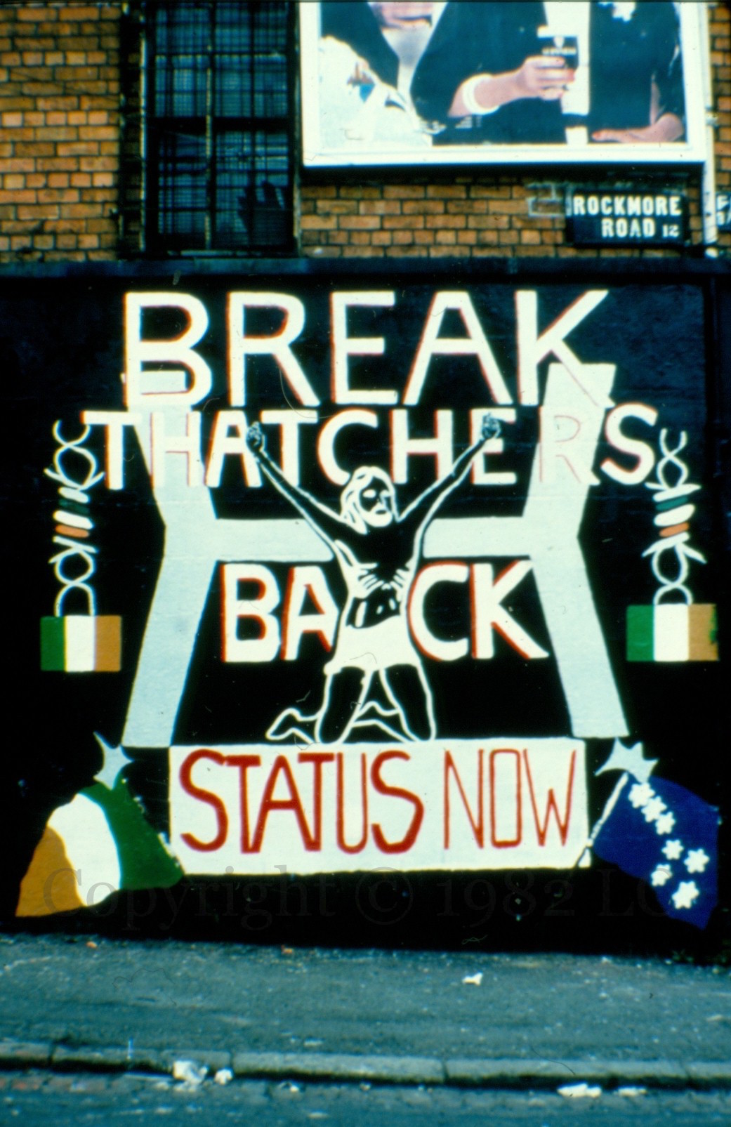 Here is a 1982 image of the Break Thatcher’s Back mural in Rockmore Road, Belfast, showing a blanket man with outstretched arms demanding “status now”, framed by a large “H” and surrounded by barbed wire, Tricolours, and the Starry Plough. In 1981, there was a Sean O’Casey quote on the left, rather than a lily and the year of the Easter Rising — 1916. “Free Belfast” in the top left.