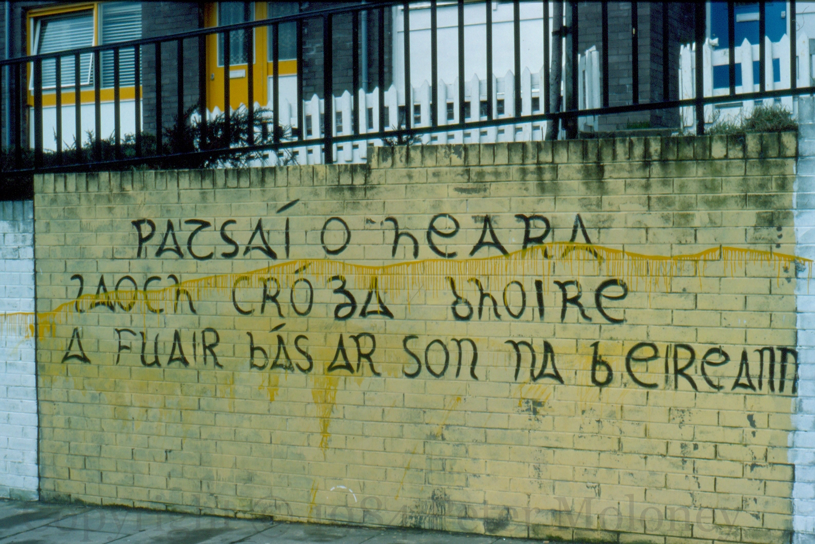 Laoch Cróga Dhoıre 1984-01-082025-01-31Extramural Activity “Patsaí O’Heara, laoch cróga Dhoıre, a fuaır bás ar son na hÉıreann.” “Patsy O’Hara, Derry’s brave warrior/hero, who died on behalf of Ireland.” Graffiti in Bishop Street, Derry. Click image to enlargeCopyright © 1984 Peter MoloneyM00242 Share this: Share on X (Opens in new window) X Share on Facebook (Opens in new window) Facebook Like Loading... Related