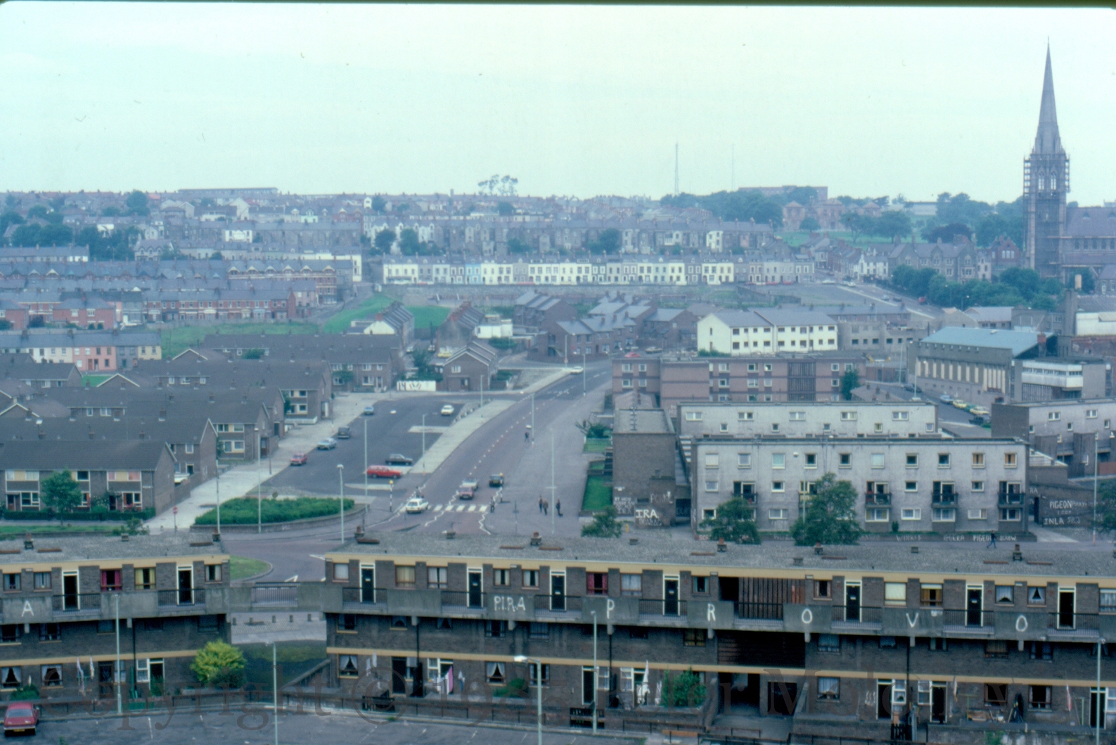 A view from on high of the flats in the middle of Fahan Street, Derry, with “PROVOS” written one letter at a time. Glenfada Park is in the top right (see Derry Not Londonderry and Fianna Éireann). The second gives an even wider view of the Bogside.