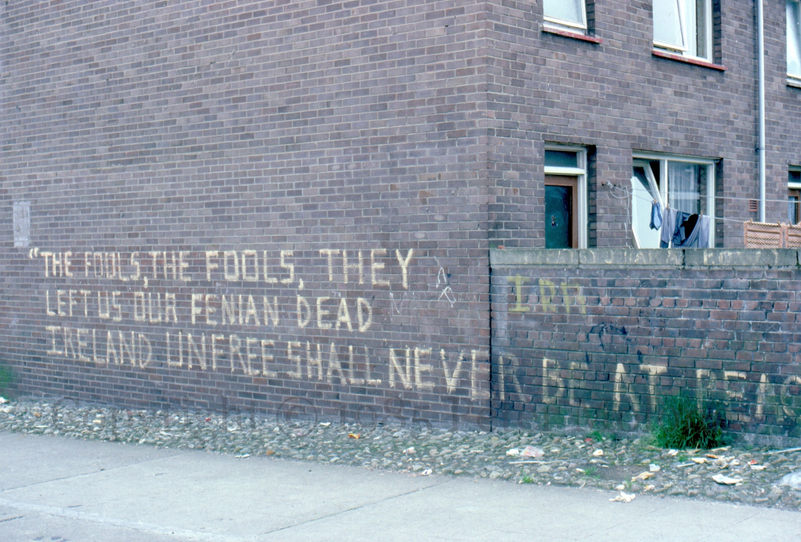 A line from Padraig Pearse’s oration at the funeral of O’Donovan Rossa: “The fools, the the fools, they [have] left us our fenian dead. Ireland unfree shall never be at peace.”