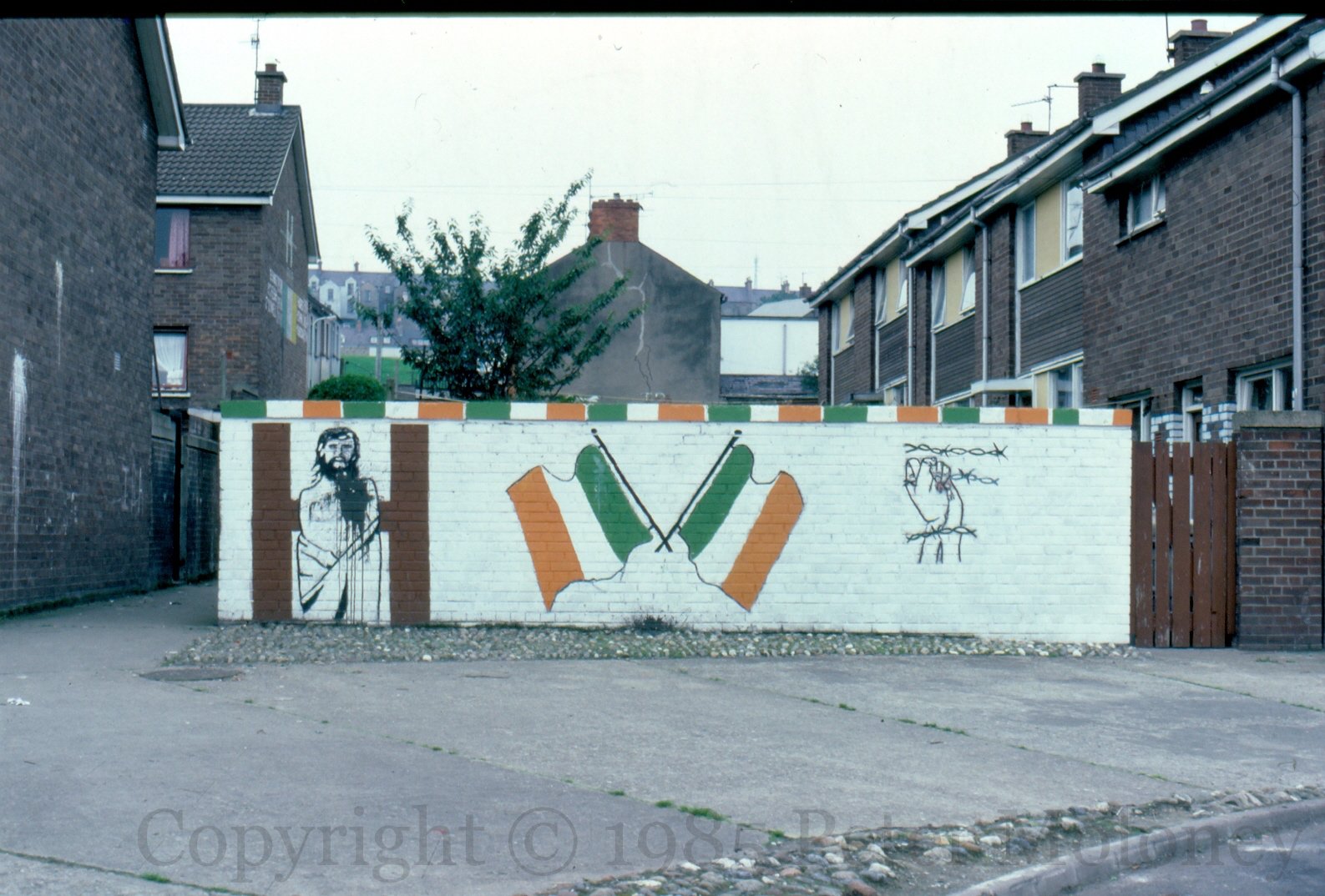 A prisoner on the blanket stands in front of a brown “H”. On the right hand side, a fist clutches a strand of barbed wire. There are also hunger strikers’ names on the gable wall to the left. Fahan Street, Derry. For the mural on the background-left wall, see IRA (P).