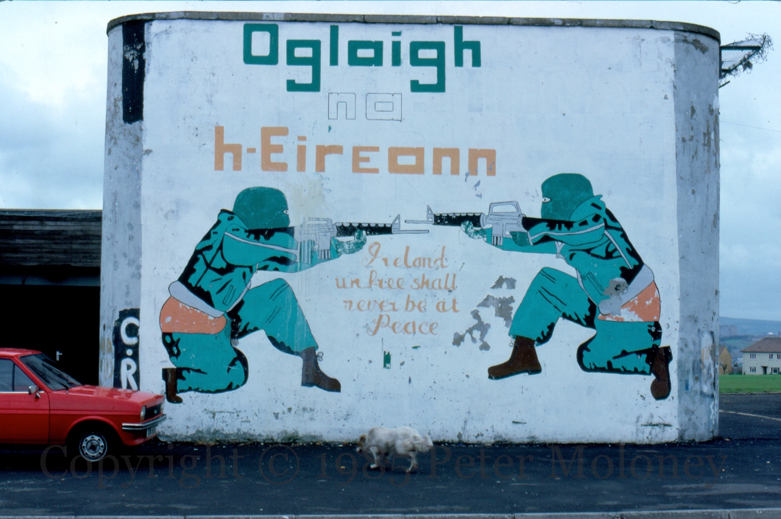 A pair of crouched volunteers with weapons aimed below stylised block writing. Pearse’s “Ireland unfree shall never be at peace” (and a dog) take centre stage. Properly, with fadas, “Óglaıgh Na hÉıreann”. Central Drive, Derry.