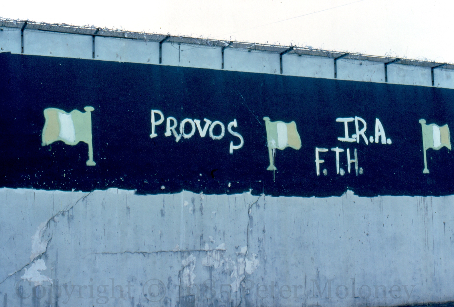 Provos 1985-02-042025-01-31Extramural Activity “Provos”, “IRA” and “FTH” in an unknown street, Belfast. Please e-mail/comment if you know the location. Click image to enlargeCopyright © 1985 Peter MoloneyM00305 locationunknown Share this: Click to share on X (Opens in new window) X Click to share on Facebook (Opens in new window) Facebook Like Loading... Related