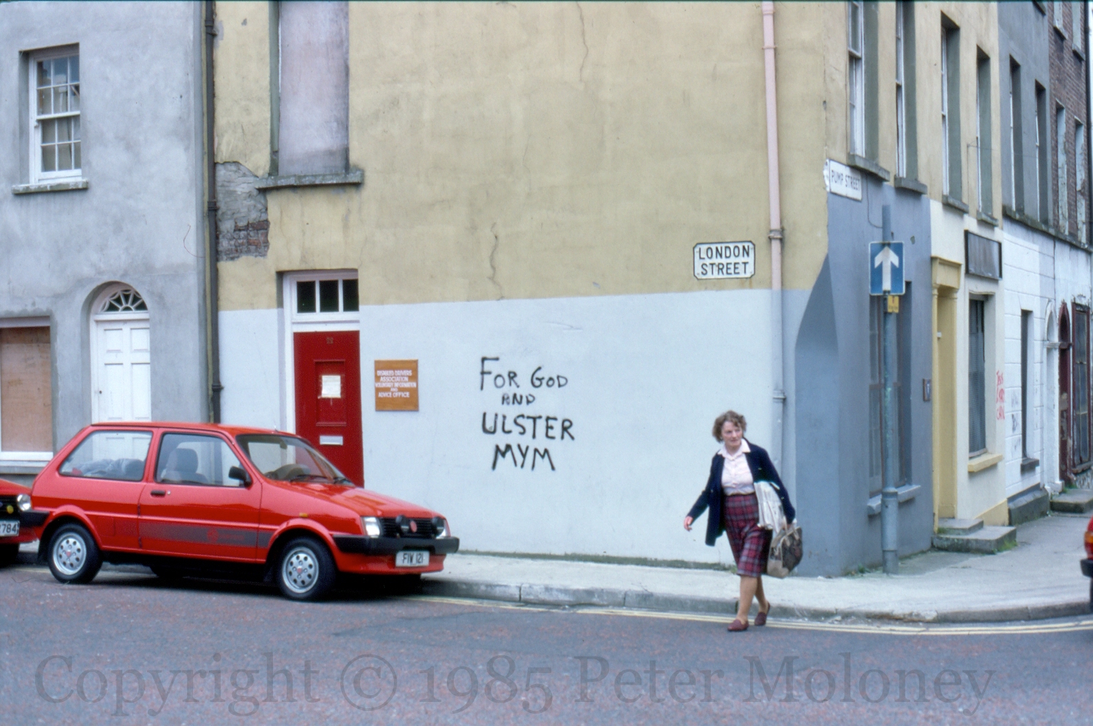 Here are a number of loyalist graffiti from Londonderry, with slogans such as “UVF”, “UDA”, “UFF”, “Taigs out” and “NF” (National Front) with swastika, as well as “Londonderry Not Derry” (in response to the various ‘Derry not Londonderry’ pieces in republican areas (see Derry Not Londonderry, It’s Derry Not Londonderry, Do You Live In Londonderry?, Stoop Down Low Party, and Vote SDLP For A Better Londonderry), and “For God and Ulster MYM” (“MYM” = “? Young Militants”?). The fourth image (which is from London Street) shows a contested wall, sporting both loyalist and republican (“Provos rule Derry/Doire”) phrases. There is also “FZTR” – Fountain Zulu Tartan rules.