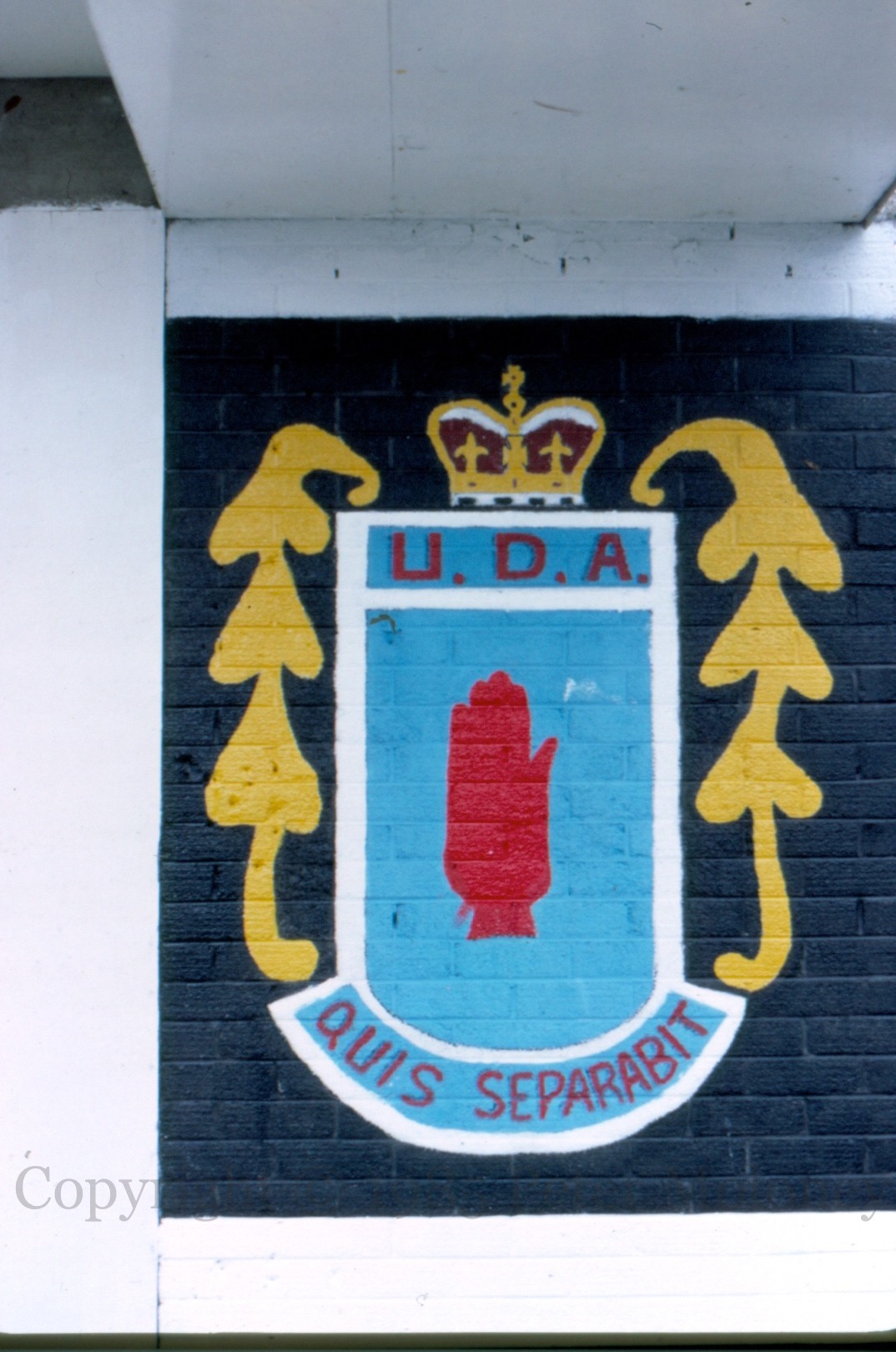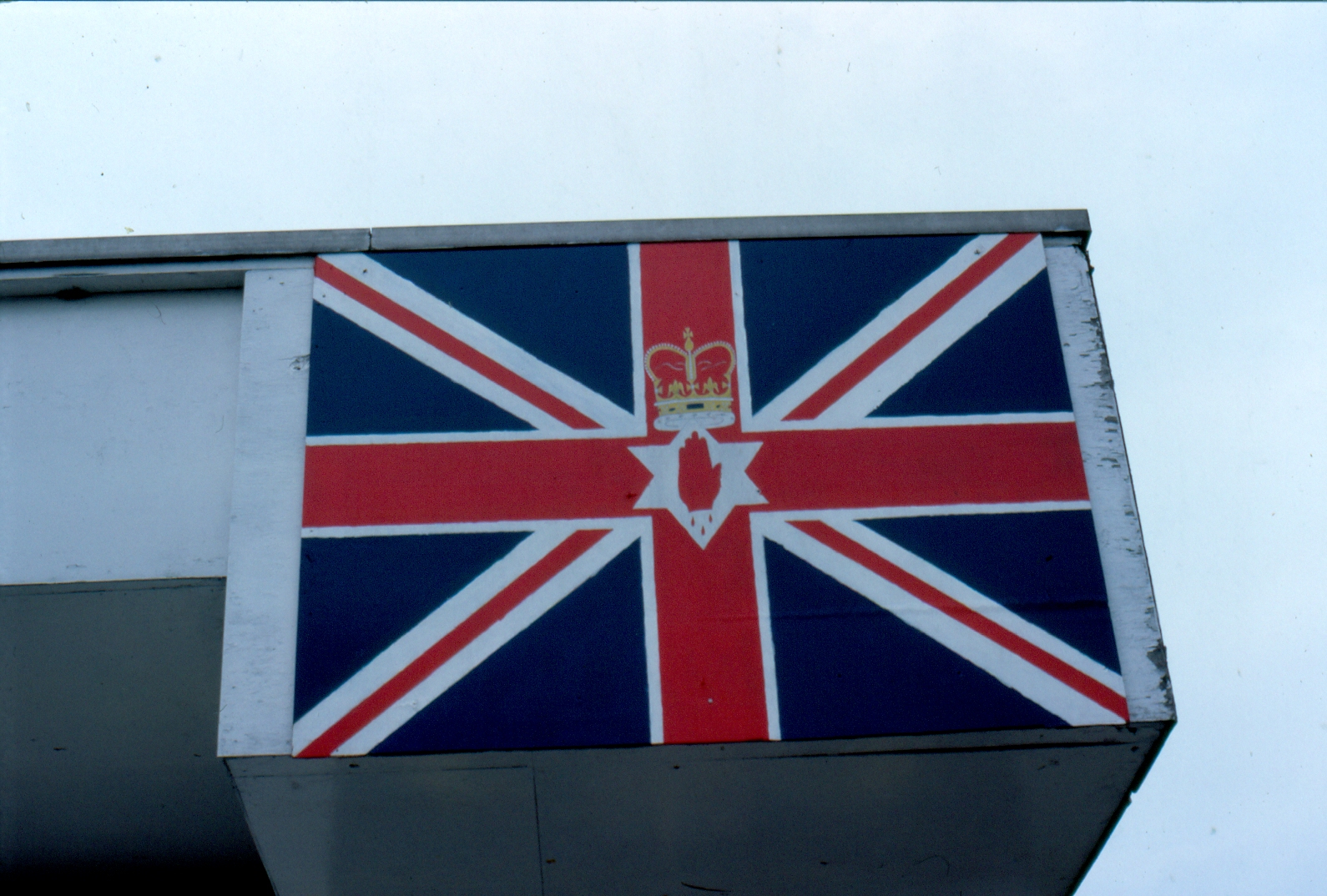 Here are a dozen images of the (in-progress) murals on the building at the junction of The Fountain/Wapping Lane/Kennedy Street (which is currently the Cathedral Youth Club) in London-/Derry. They include the arms of Londonderry, a Union Flag modified with six-pointed star, the red hand of Ulster, and the crest of the UDA.