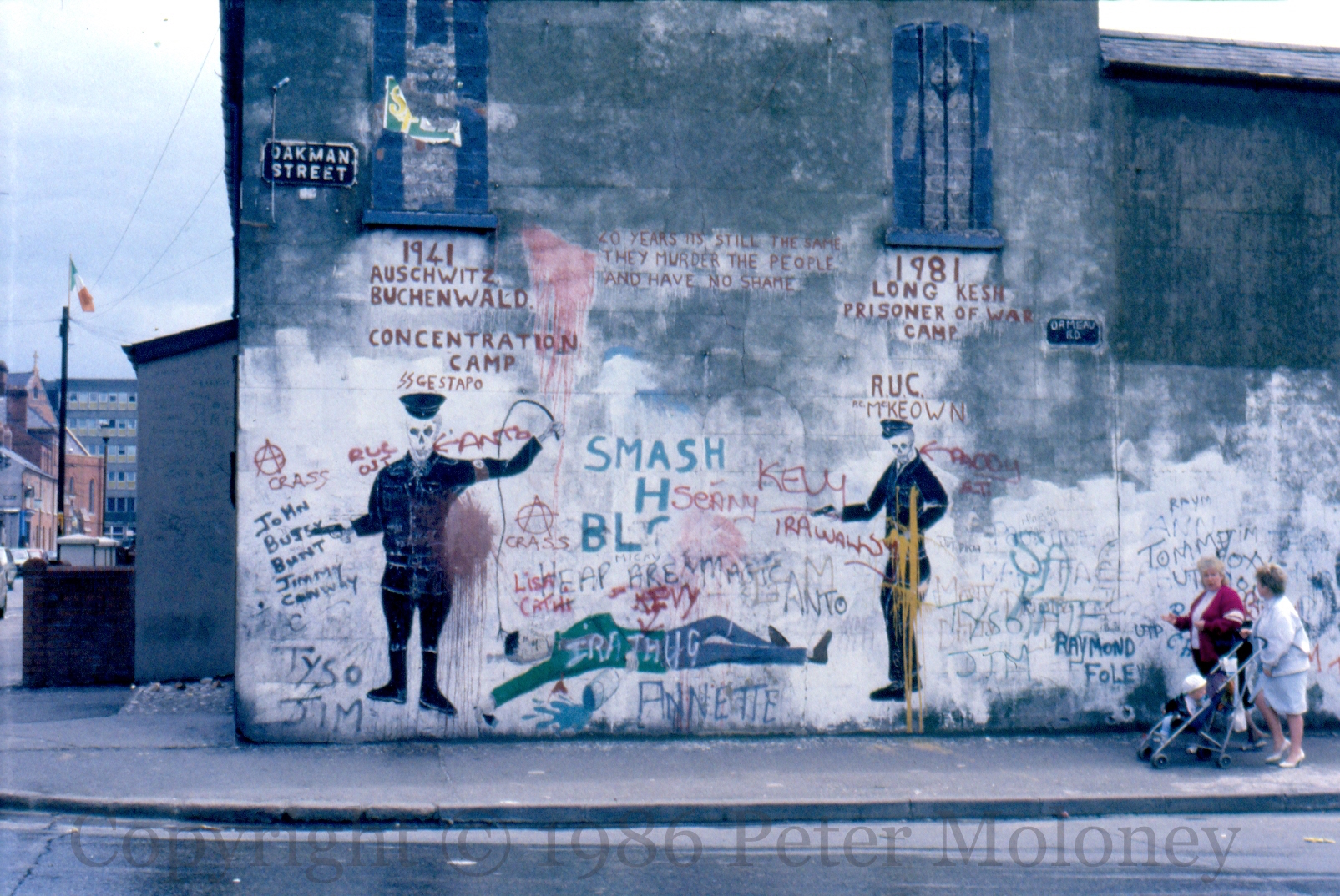 “1941 Auschwitz, Buchenwald; 1981 Long Kesh prisoner of war camp” – a repeatedly vandalised mural in Oakman Street, Belfast. Centrally pictured is the killing of Michael McCartan, shot by an RUC officer named McKeown (named on the right) while painting graffiti in south Belfast. For a detailed description see BritishArmyKillings. “20 years it’s still the same – they murder people and have no shame.”