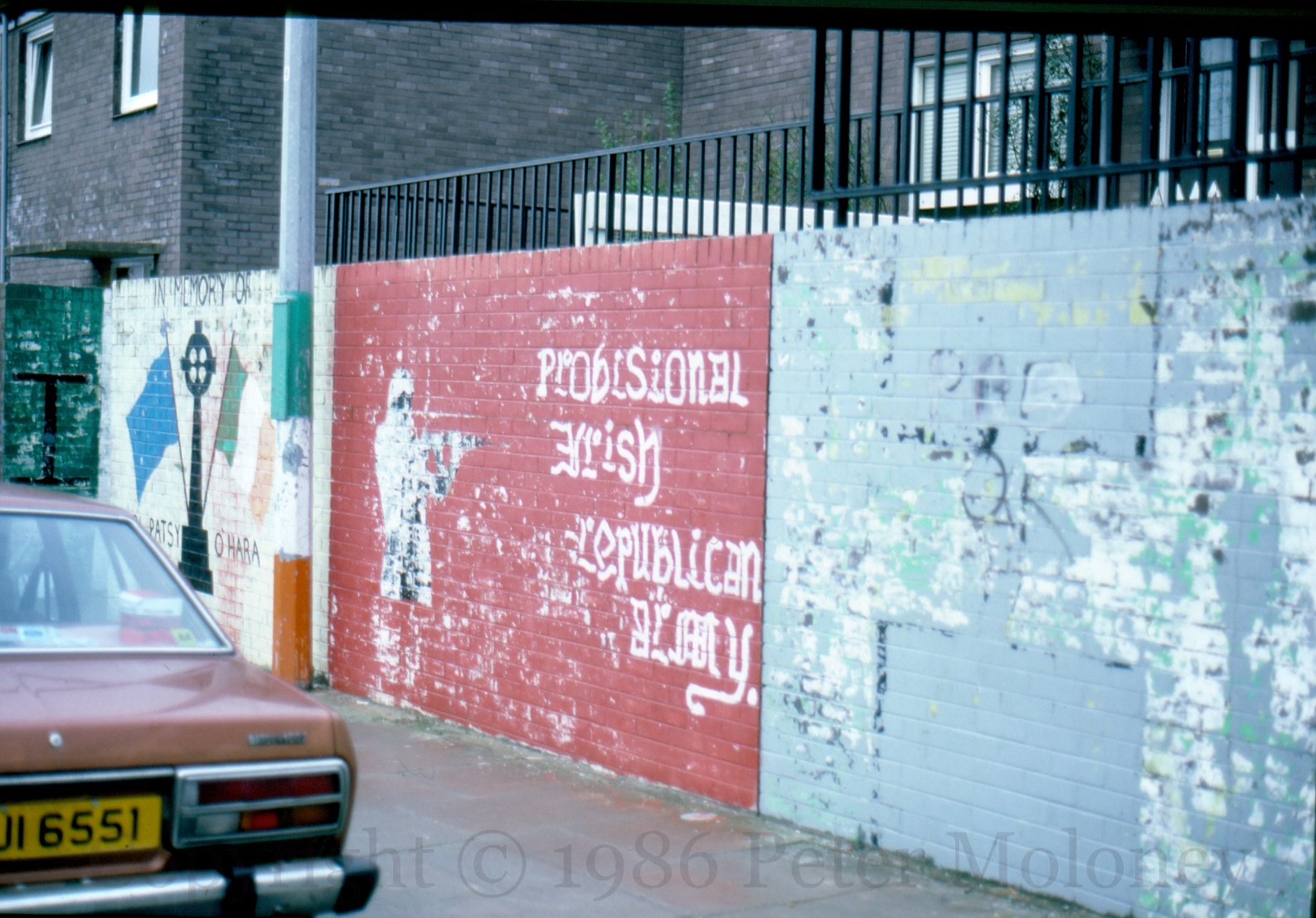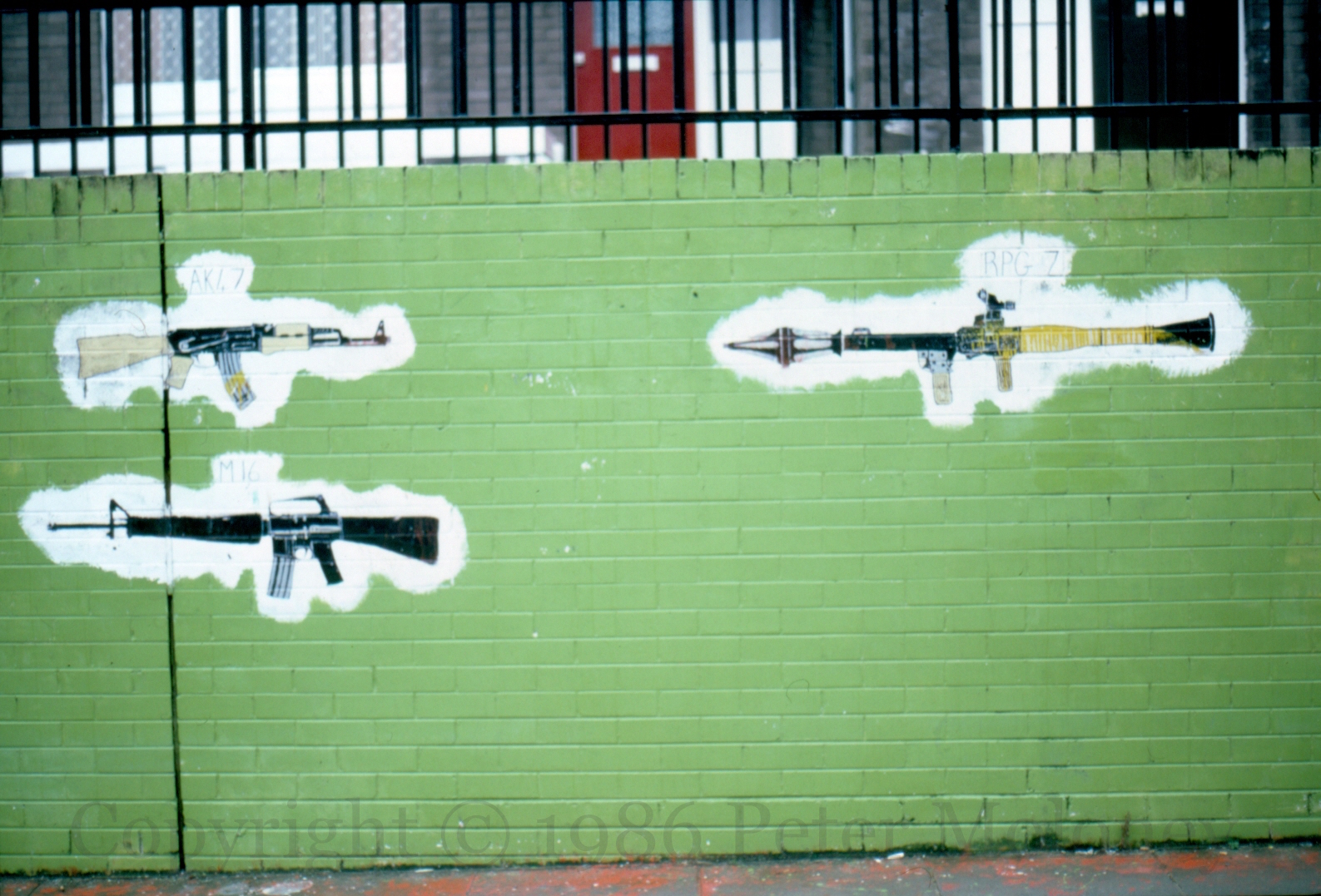 These 1986 images of Bishop Street, Derry, show various murals falling into disrepair, though the Weapons Of The Armed Struggle panel has been cleaned up. Here is the complete wall in 1982.