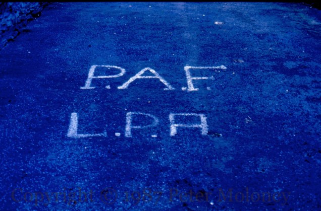 Here are two pieces of graffiti on the path around the city walls in Londonderry: “Londonderry FZTR”. “Fountain Zulu Tartan rules”, according to Stephen Ward. “PAF” = Protestant Action Force; “LPA” = “Loyalist Prisoners’ Association”