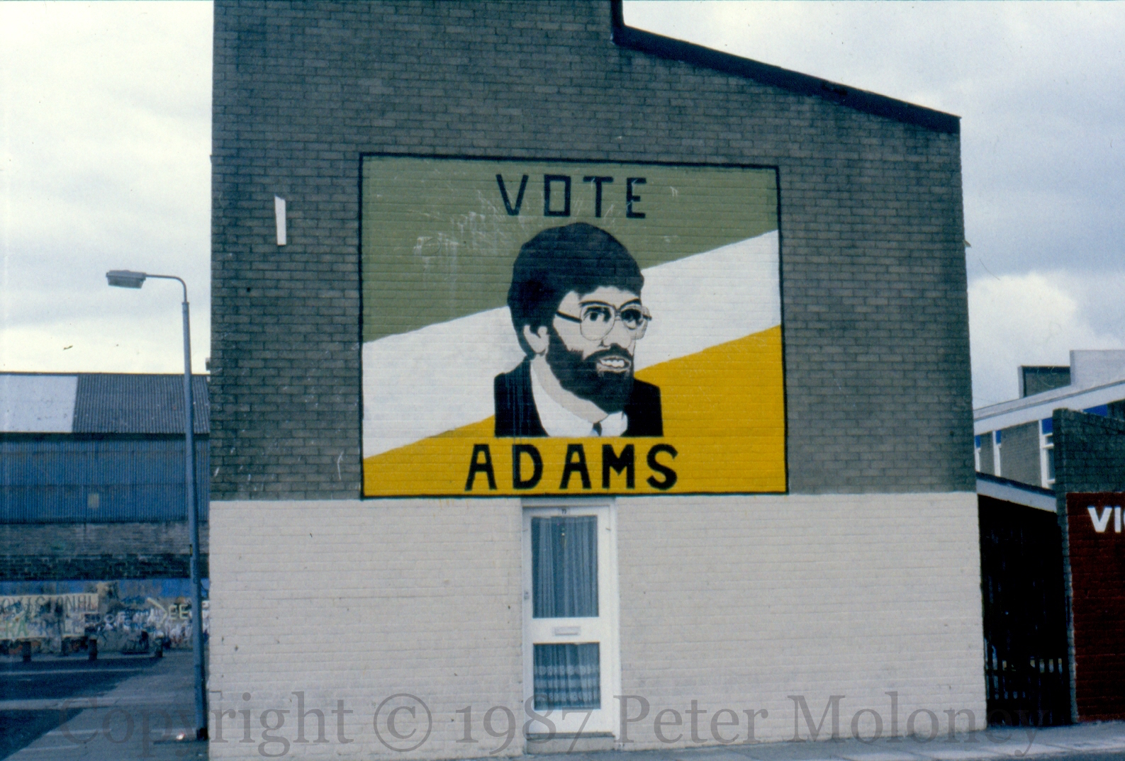 An electoral portrait of Sınn Féın candidate Gerry Adams, against a background of green, white, and orange.
