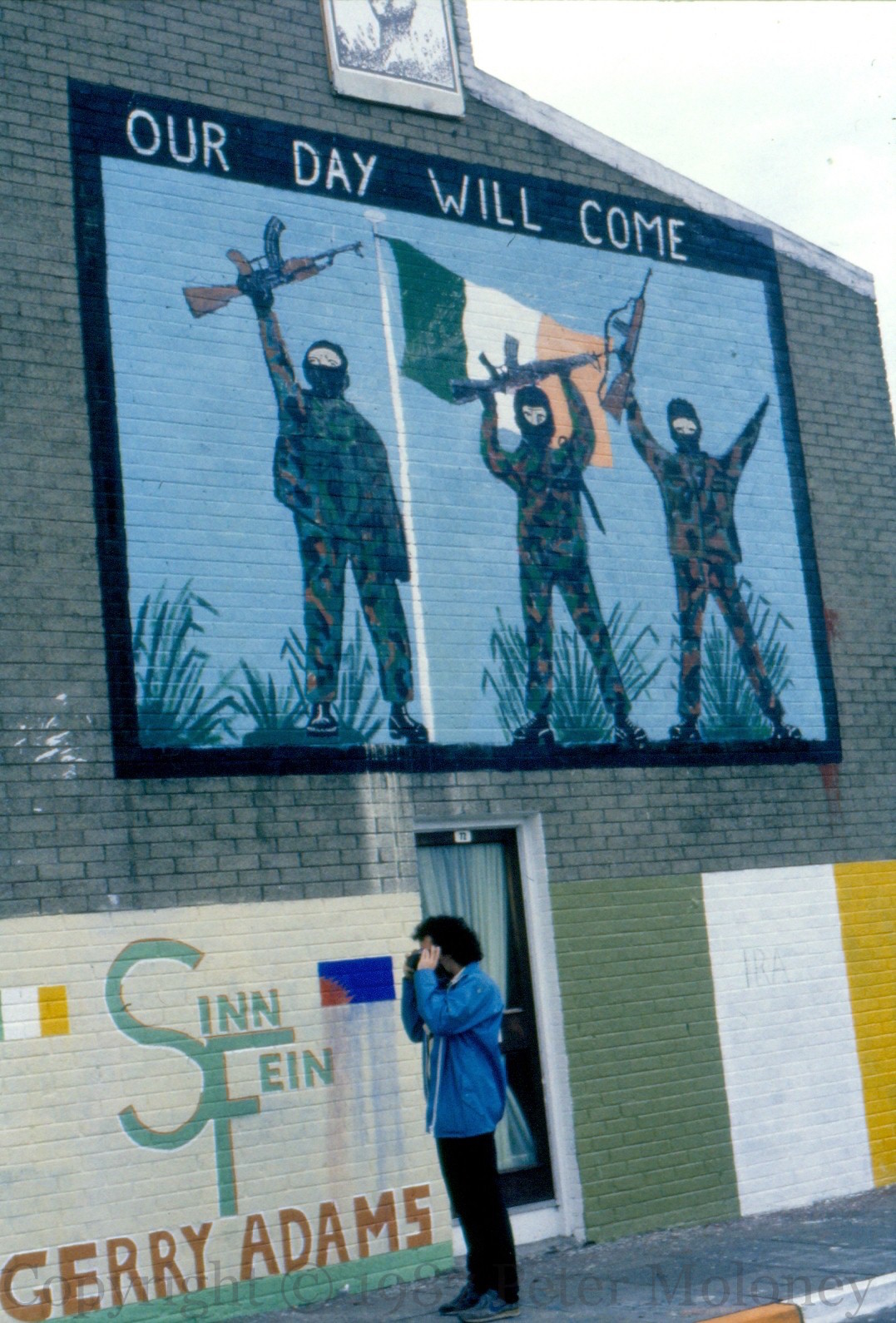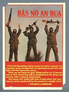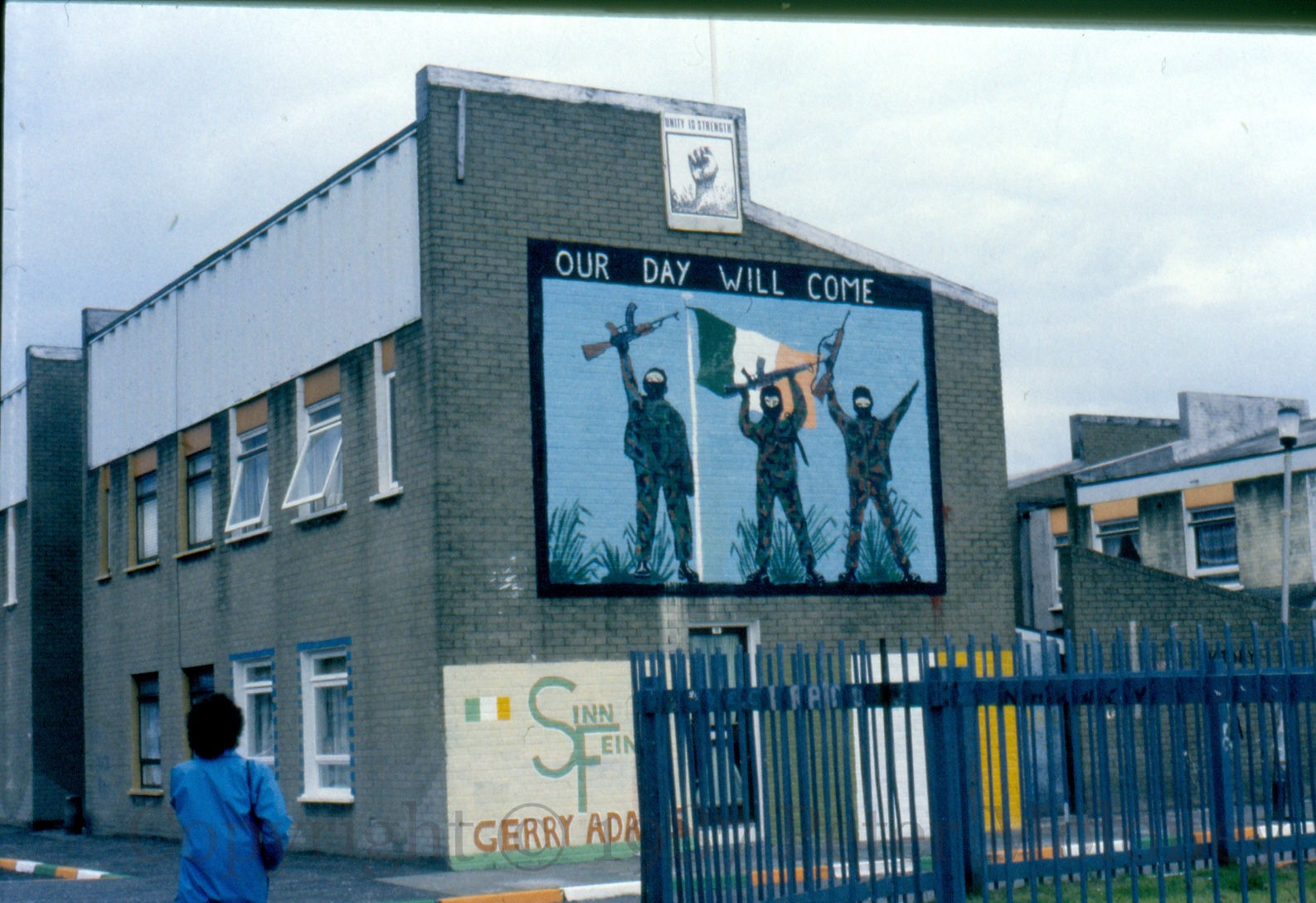 The main panel, of three IRA volunteers with raised weapons, was painted by Sean ‘Conker’ Connolly, based on the poster below. Also on the wall are a Tricolour, “Sinn Fein/Gerry Adams” and a small board at the top with a raised fist and the slogan “Unity is strength”. Westrock Drive, Belfast.
