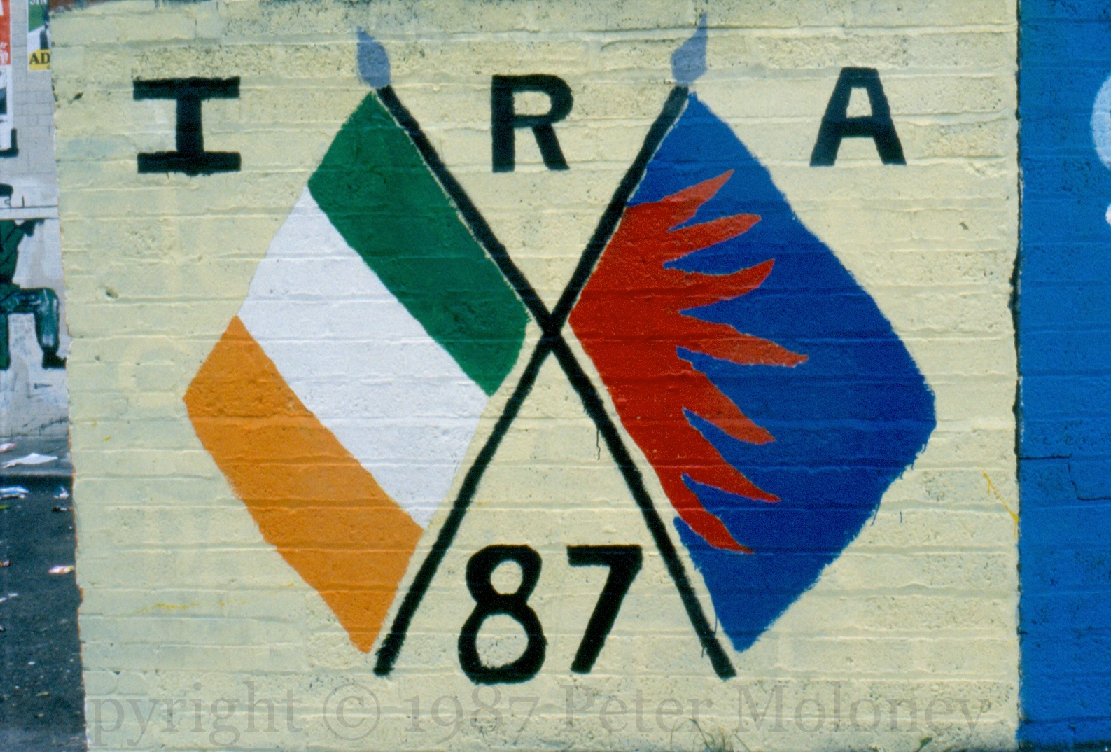 IRA 87 1987-01-302025-02-02Extramural Activity Tricolour and Sunburst flags on the Whiterock Road, west Belfast. Click image to enlargeCopyright © 1987 Peter MoloneyM00474 Share this: Share on X (Opens in new window) X Share on Facebook (Opens in new window) Facebook Like Loading... Related