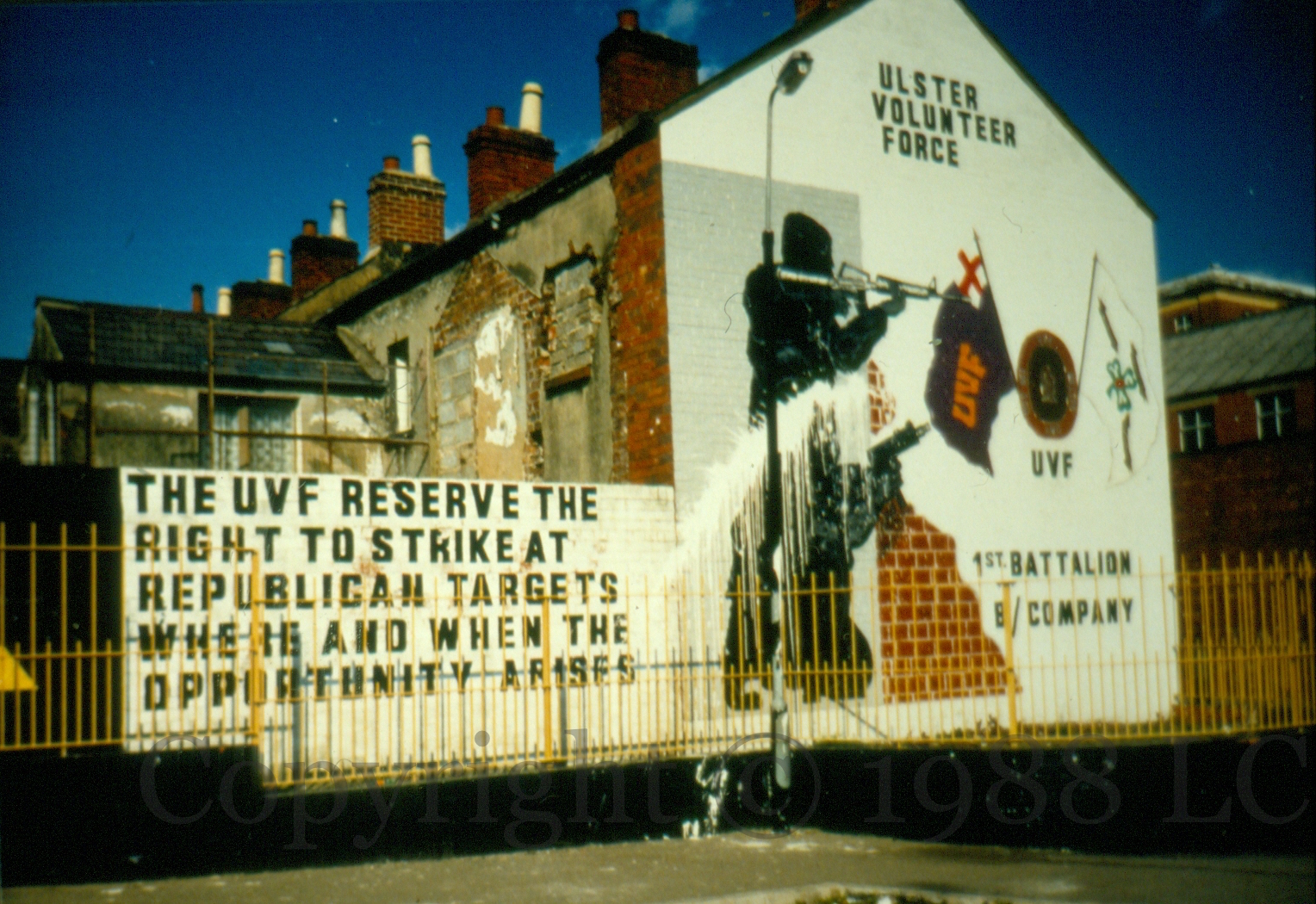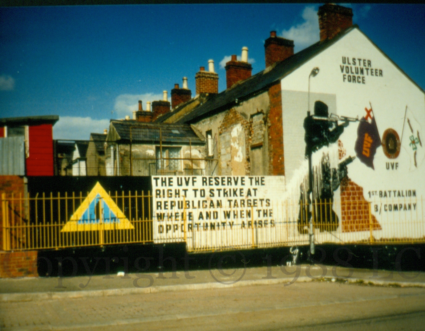 The yellow triangle of the PAF (Protestant Action Force, a cover for the UVF) with the words”The UVF reserve the right to strike at republican targets where and when the opportunity arises.” with adjacent UVF/YCV hooded gunmen mural in Ohio Street, Belfast.
