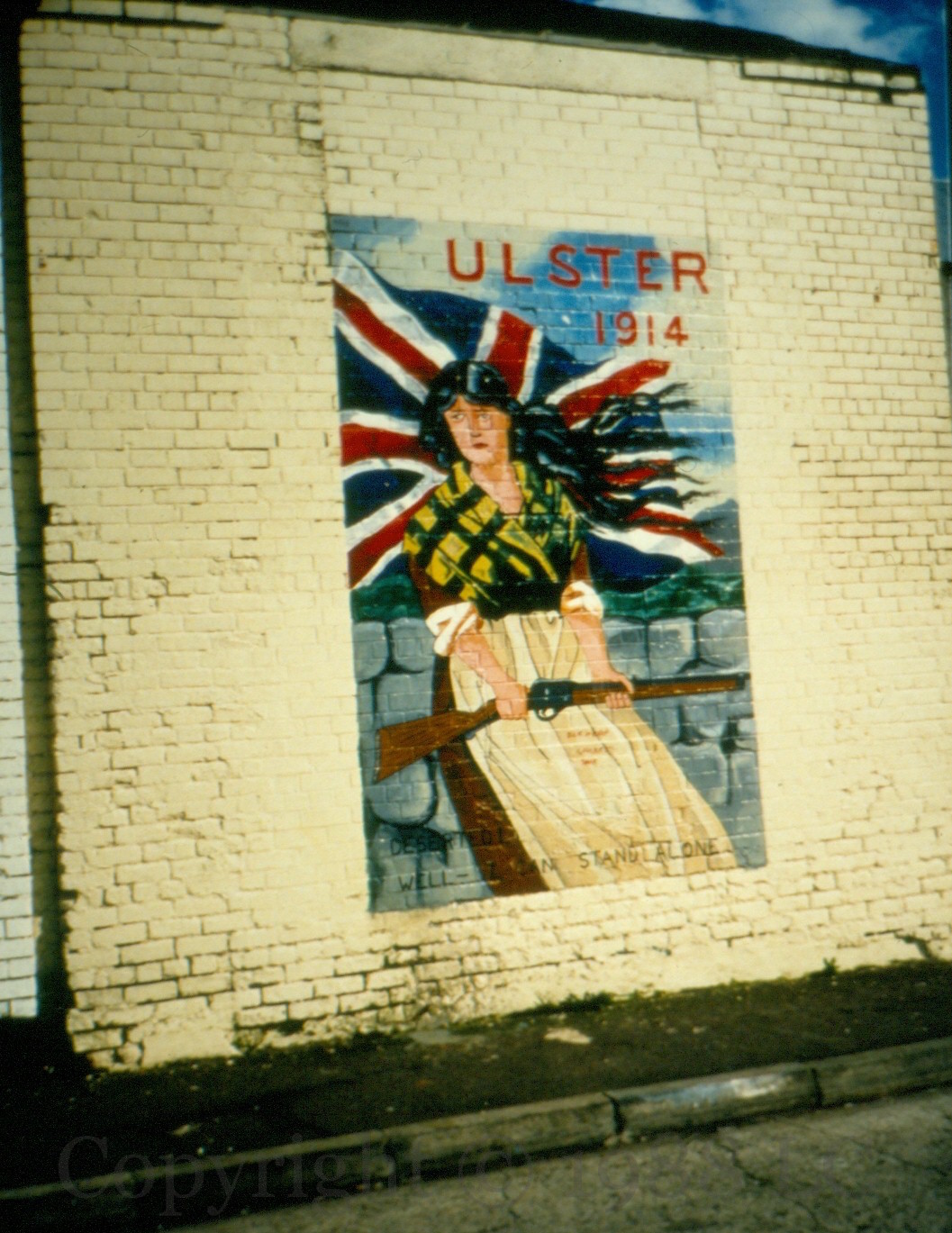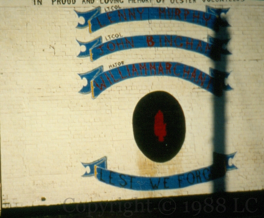 These two murals are side-by-side in Craven Street. On the right, a farmer’s wife defends the farm (the stone wall) in order to preserve it as part of the UK (the Union Flag) despite the threat of Home Rule; on the left, “in proud and loving memory” of three UVF volunteers assassinated by the IRA: Shankill Butcher Lenny Murphy, John Bingham, and William “Frenchie” Marchant. “Lest we forget.”