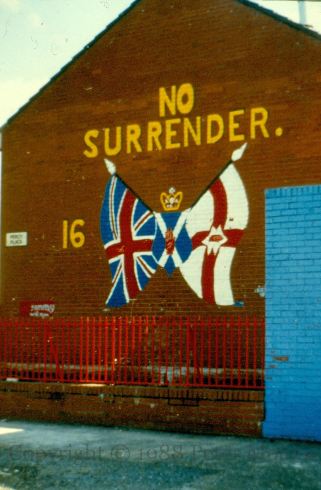 No Surrender 1690 1988-01-312025-02-05Extramural Activity The left-most mural (No. 1 of 9) in Percy Place, Belfast. The central motif of a red hand on a Saltire is unusual. 1690 is the date of King William III’s victory at the Battle of the Boyne. Click image to enlargeCopyright © 1988 LCM00567 Share this: Click to share on X (Opens in new window) X Click to share on Facebook (Opens in new window) Facebook Like Loading... Related