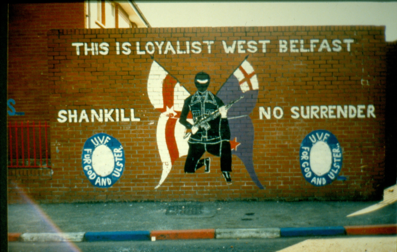 This Is Loyalist West Belfast 1988-02-052025-02-05Extramural Activity A hooded UVF gunman kneels between the Ulster banner and the UVF flag. “Shankill”, “No surrender”. No 6 of 9 in Percy Place, Belfast. Click image to enlargeCopyright © 1988 Peter MoloneyM00571 Share this: Click to share on X (Opens in new window) X Click to share on Facebook (Opens in new window) Facebook Like Loading... Related