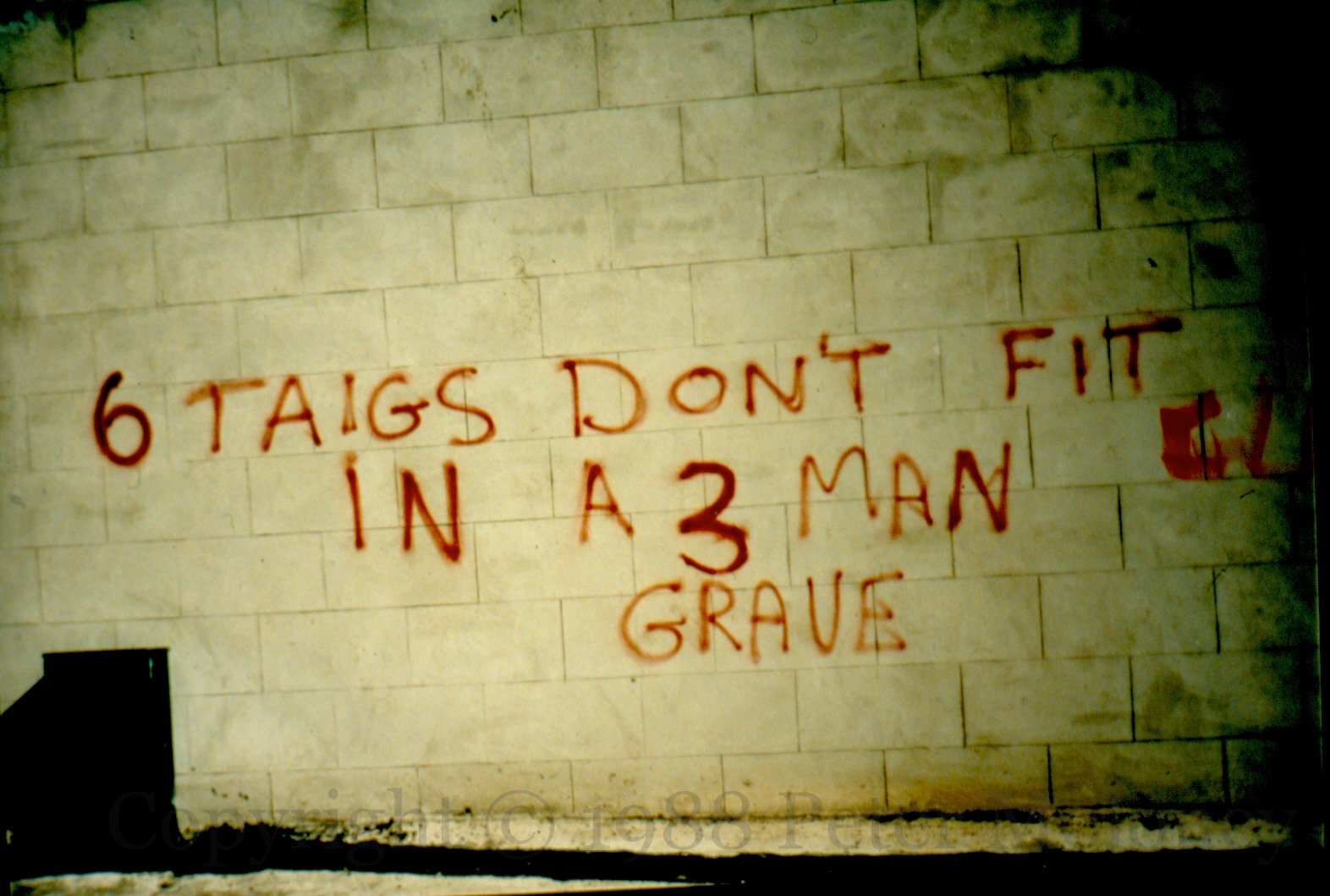 6 Taigs Don’t Fit In A 3 Man Grave 1988-02-122025-02-05Extramural Activity Loyalist graffiti (Glencairn area, unknown street), referencing the three people killed by Michael Stone at the funeral of the Gibraltar 3 in Milltown cemetery. Click image to enlargeCopyright © 1988 Peter MoloneyM00582 locationunknown Share this: Click to share on X (Opens in new window) X Click to share on Facebook (Opens in new window) Facebook Like Loading... Related