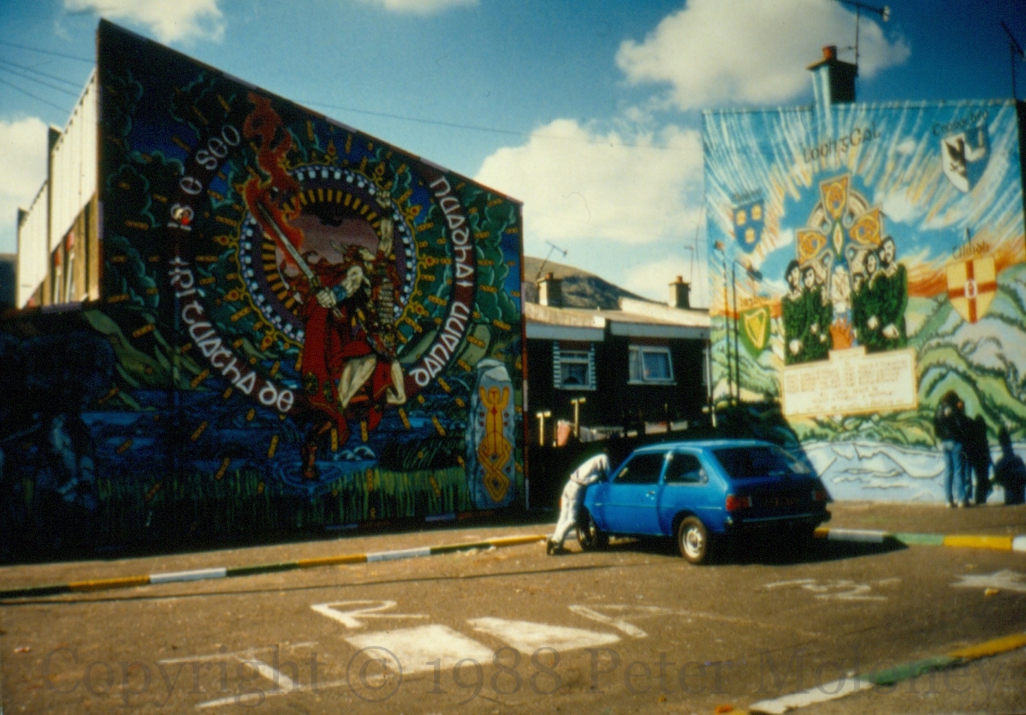 Here is an image of the Nuada and Loughgall/Loch gCál murals together at the top of Springhill Avenue in west Belfast, painted by Mo Chara and inspired by the work of Jim Fitzpatrick.