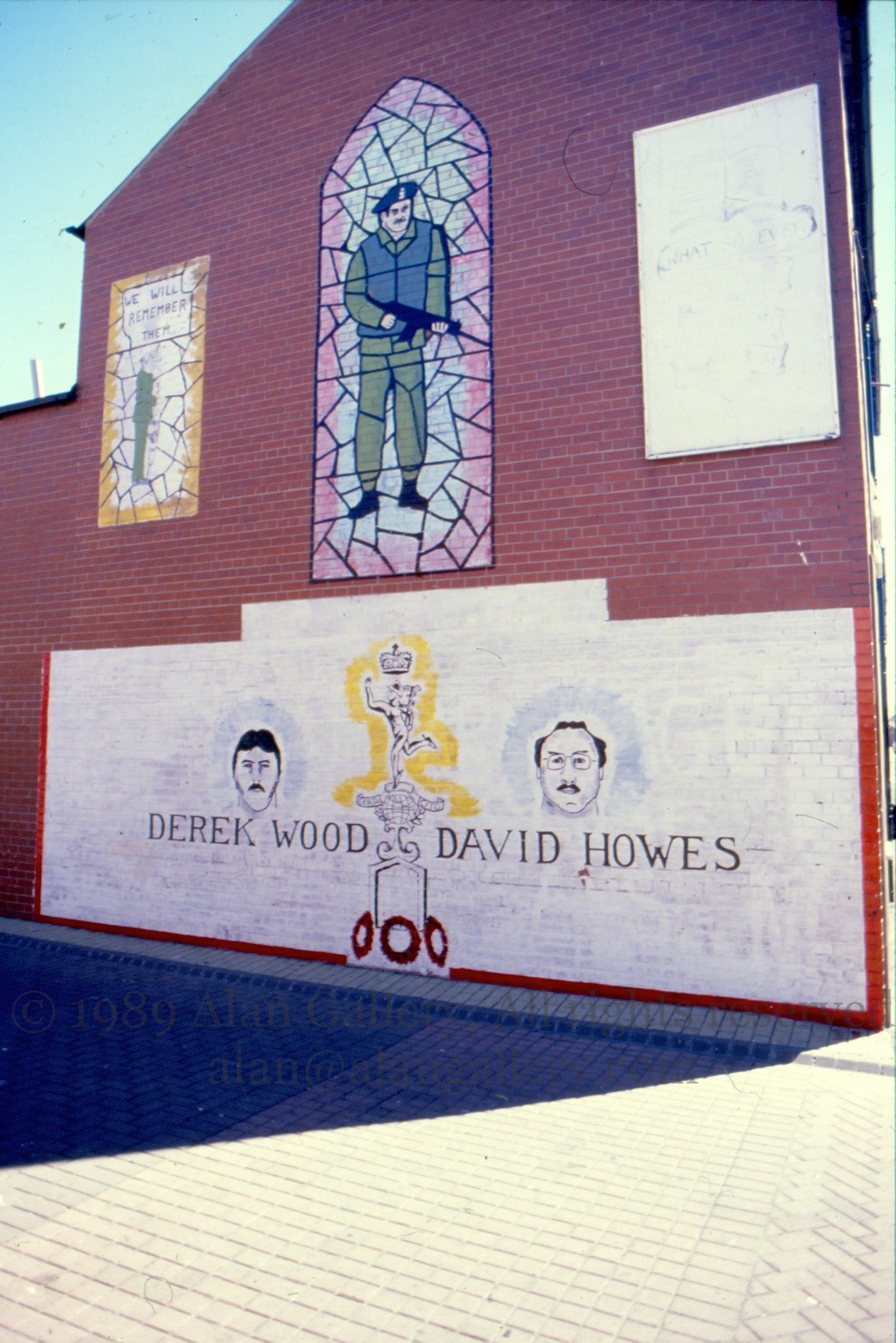 Derek Wood and David Howes were two British Army corporals, killed on March 19, 1988, during the funeral of IRA volunteer Caoimhín Mac Brádaigh/Kevin Brady, who was killed by Michael Stone at the funeral of the Gibraltar 3. The mural shows a soldier in stained glass, as well as portraits of the two corporals. “We will remember them.” Mersey Street, Belfast