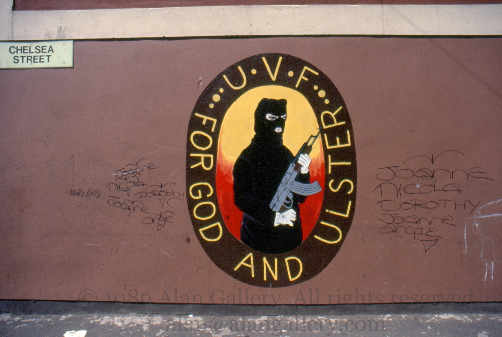 UVF Masked Gunman 1989-01-132025-02-06Extramural Activity The centre of the UVF emblem (typically a red hand) is replaced by masked volunteer with AK-47. “For God and Ulster”. Chelsea Street, east Belfast Click image to enlargeCopyright © 1989 Alan Gallery, All rights reserved alan@alangallery.comM00623 Share this: Share on X (Opens in new window) X Share on Facebook (Opens in new window) Facebook Like Loading... Related