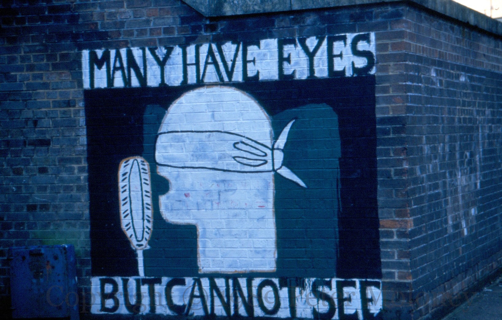 A frequent biblical idea about lack of faith (Isaiah 6:10, Jeremiah 5:21, Ezekiel 12:2, Matthew 13:15, Acts 28:27, Romans 11:8. NKJV) used to comment on censorship. Rossville Street, Derry. See previously: Many Have Eyes.