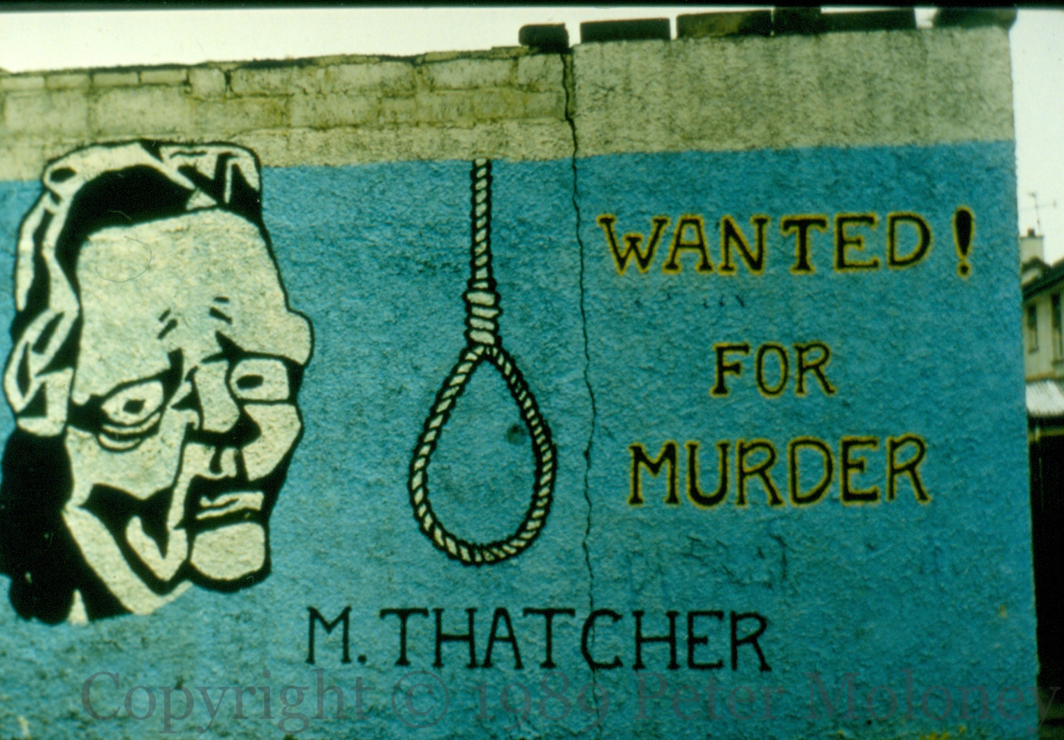 Wanted! For Murder 1989-02-102025-02-06Extramural Activity British Prime Minister M[argaret] Thatcher is presumed guilty of murder and faces death by hanging from a noose. Ballycolman, Strabane Click image to enlargeCopyright © 1989 Peter MoloneyM00697 Share this: Click to share on X (Opens in new window) X Click to share on Facebook (Opens in new window) Facebook Like Loading... Related