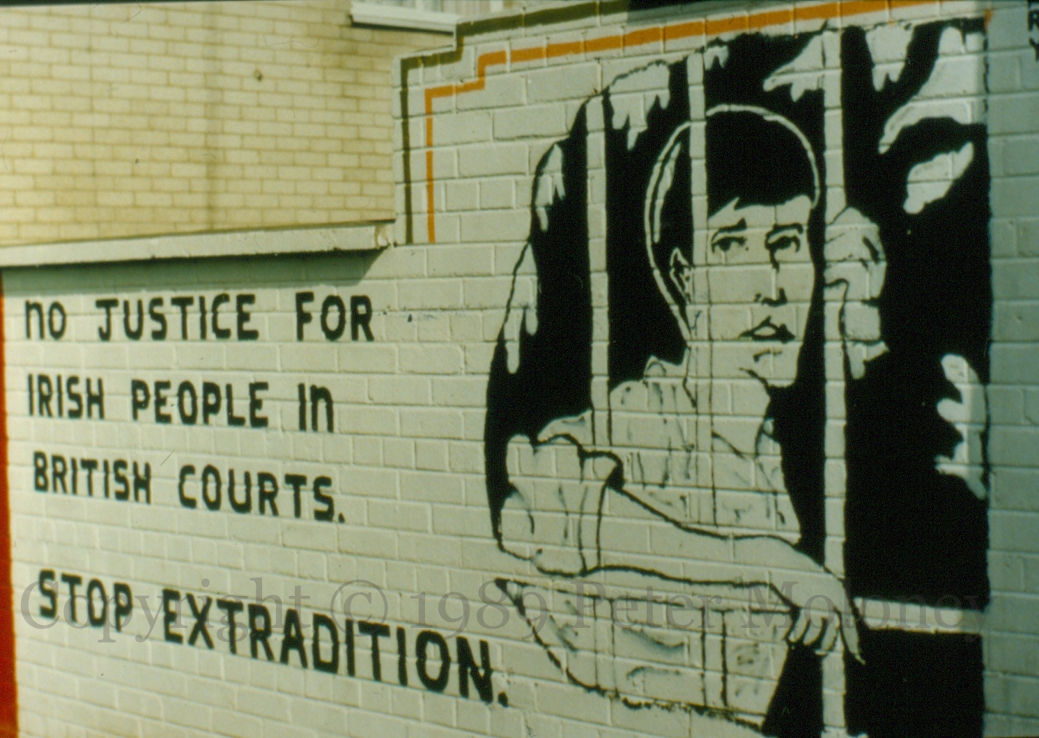 Stop Extradition 1989-02-212025-02-06Extramural Activity A prisoner is menaced by shadows. “No justice for Irish people in British courts – Stop extradition.” Ballycolman, Strabane. Click image to enlargeCopyright © 1989 Peter MoloneyM00685 Share this: Click to share on X (Opens in new window) X Click to share on Facebook (Opens in new window) Facebook Like Loading... Related