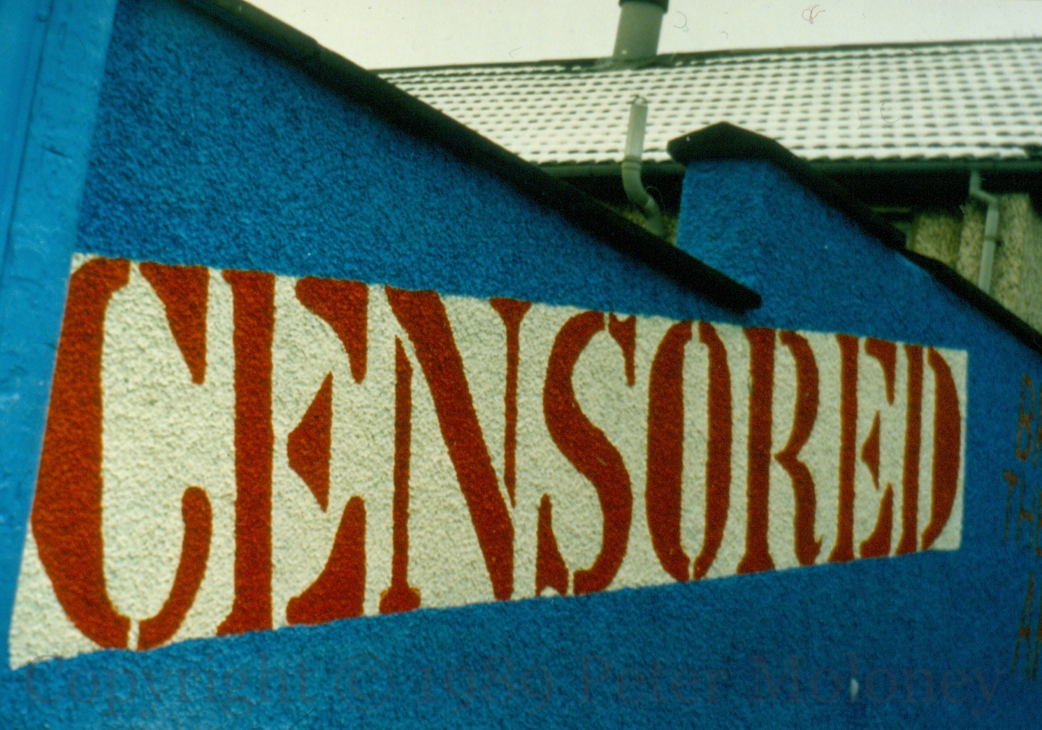Three of four parts of a long mural about censorship. In the first, a pair of “Censor Ltd” scissors cut the cord to the microphone of a speaker who is also gagged – the idea comes from a Jack Clafferty drawing, included below. The second gives figures making the case for the under-representation of Sinn Féin in government: 1 MP, 40[%] nationalist elec[torate?], 56 [city/district] council[lors]. Just out of view to the right of “Censored” is “Britain ignores the voice of arguement.”