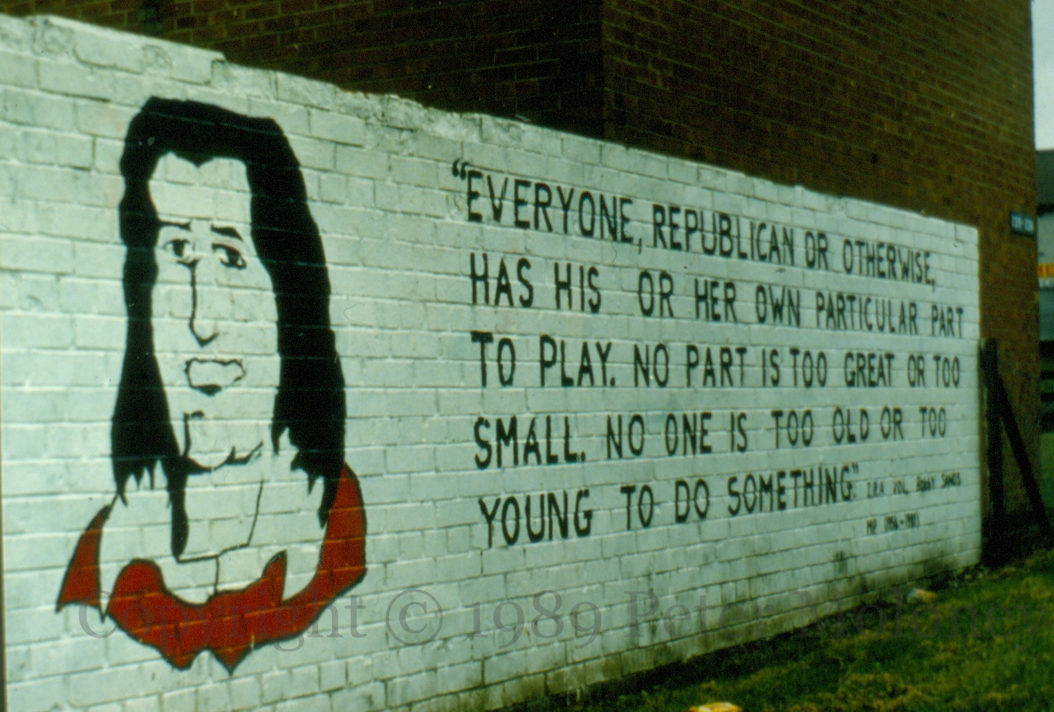 The words of a smiling Bobby Sands in Ballycolman, Strabane: “Everyone, republican or otherwise, has his or her own particular part to play. No part is too great or too small. No one is too old or too young to do something. – IRA Vol. Bobby Sands MP 1954-1981” [Diary, March 14th, 1981]