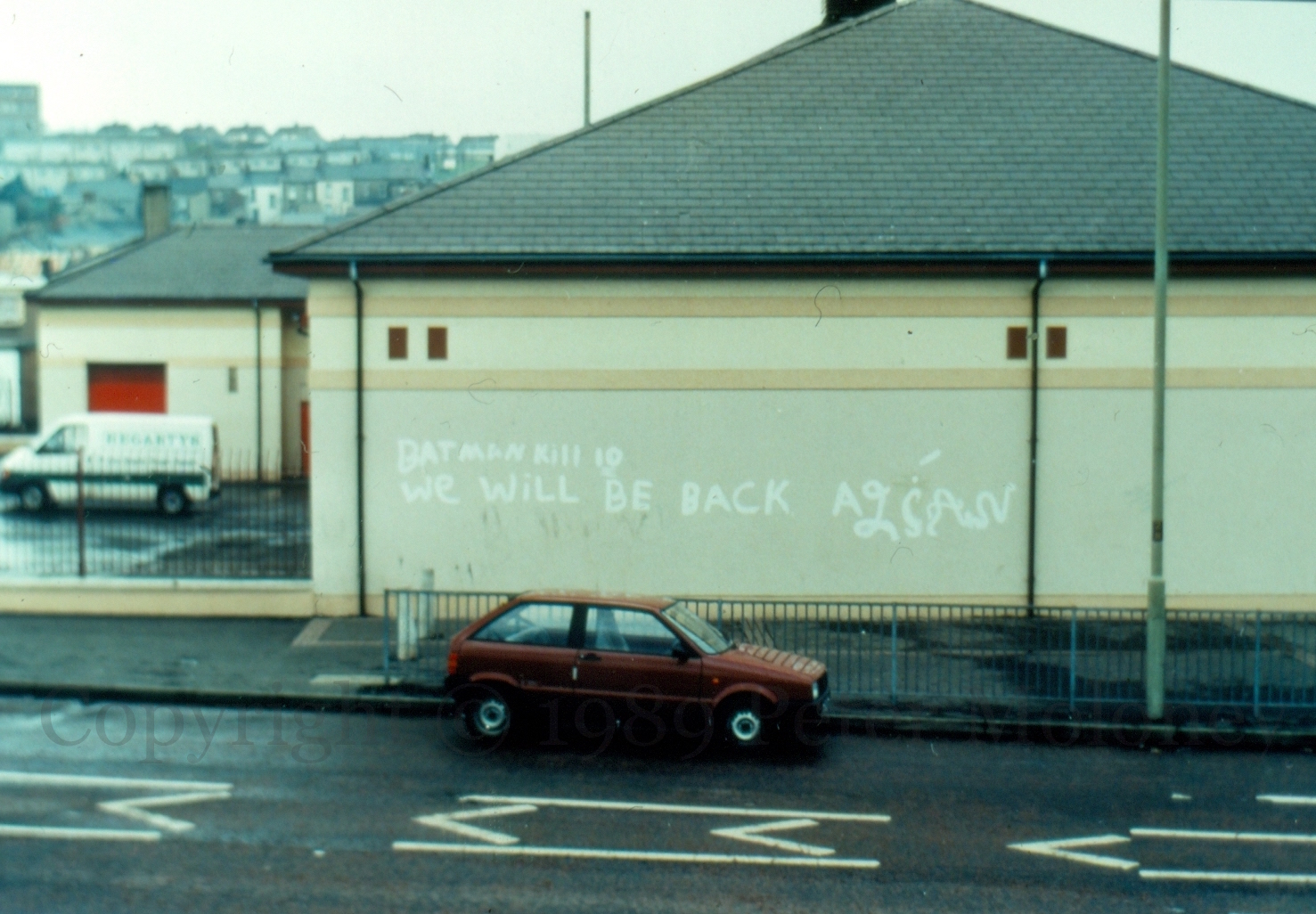 Batman Kill 10 1989-04-192025-02-06Extramural Activity Republican graffiti on Lecky Road. Derry: “Batman kill 10 – we will be back (‘agian’?)” Click image to enlargeCopyright © 1989 Peter MoloneyM00778 Share this: Share on X (Opens in new window) X Share on Facebook (Opens in new window) Facebook Like Loading... Related