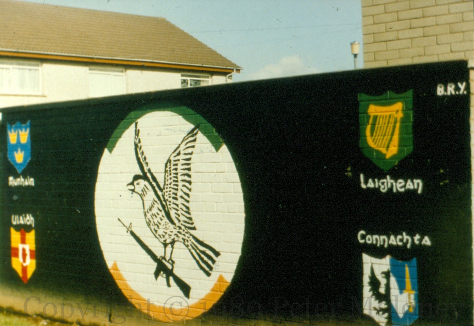 Lark Of War 1989-04-202025-02-06Extramural Activity Rather than being trapped in barbed wire, this lark carries an armalite rifle across the four provinces of Ireland. (BRY = Ballycolman Republican Youth) Ballycolman estate, Strabane Click image to enlargeCopyright © 1989 Peter MoloneyM00768 Share this: Share on X (Opens in new window) X Share on Facebook (Opens in new window) Facebook Like Loading... Related