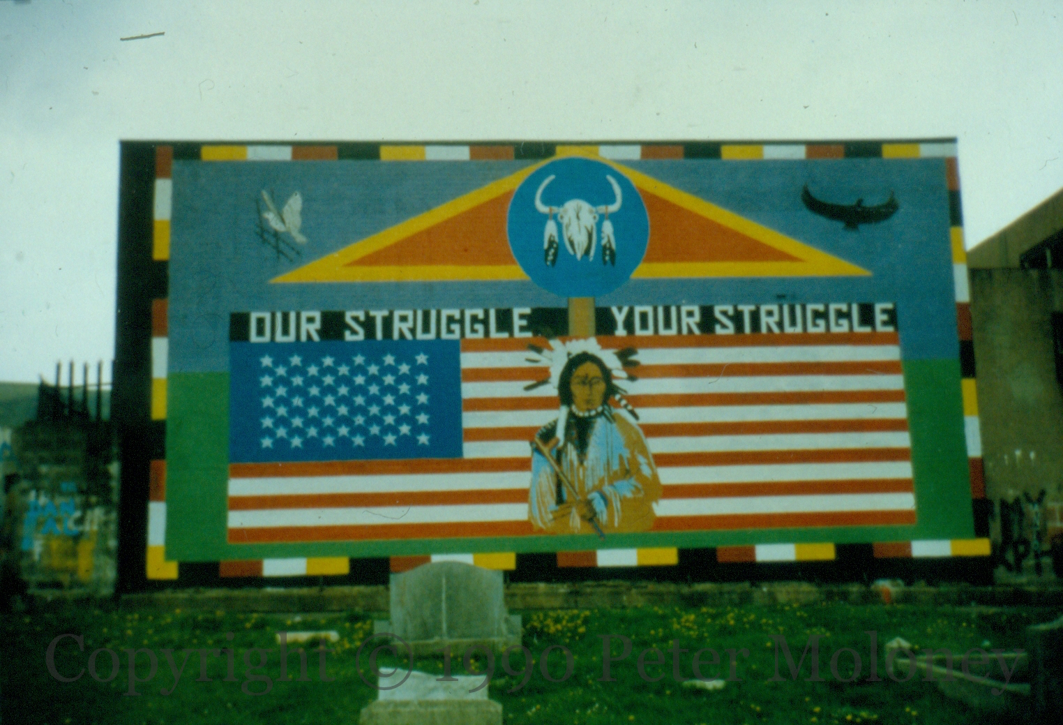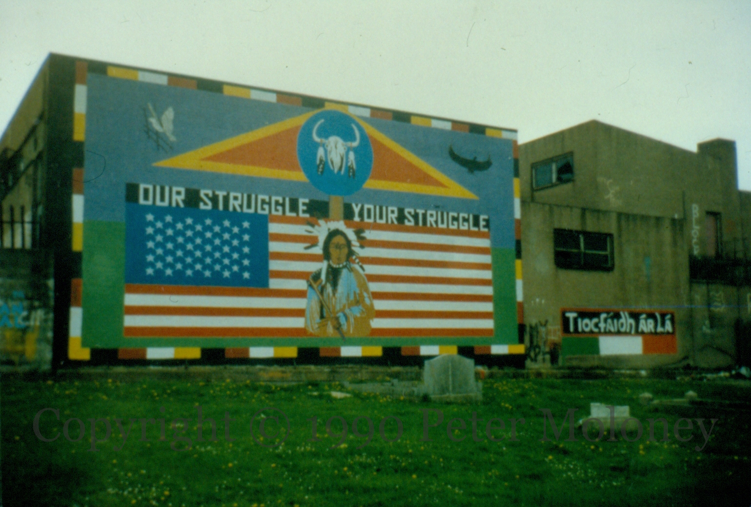 Chief sitting Bull with his back to the flag of the United States, with a lark (for the Irish struggle) and an eagle (for the Native American) and a border of the colours of humankind. Painted by Mo Chara on the wall of the (then) Ballymurphy Community Centre just off the Whiterock Road, Belfast. The wide shots show a small “Tıocfaıdh ár lá” and Tricolour to the right-hand side.