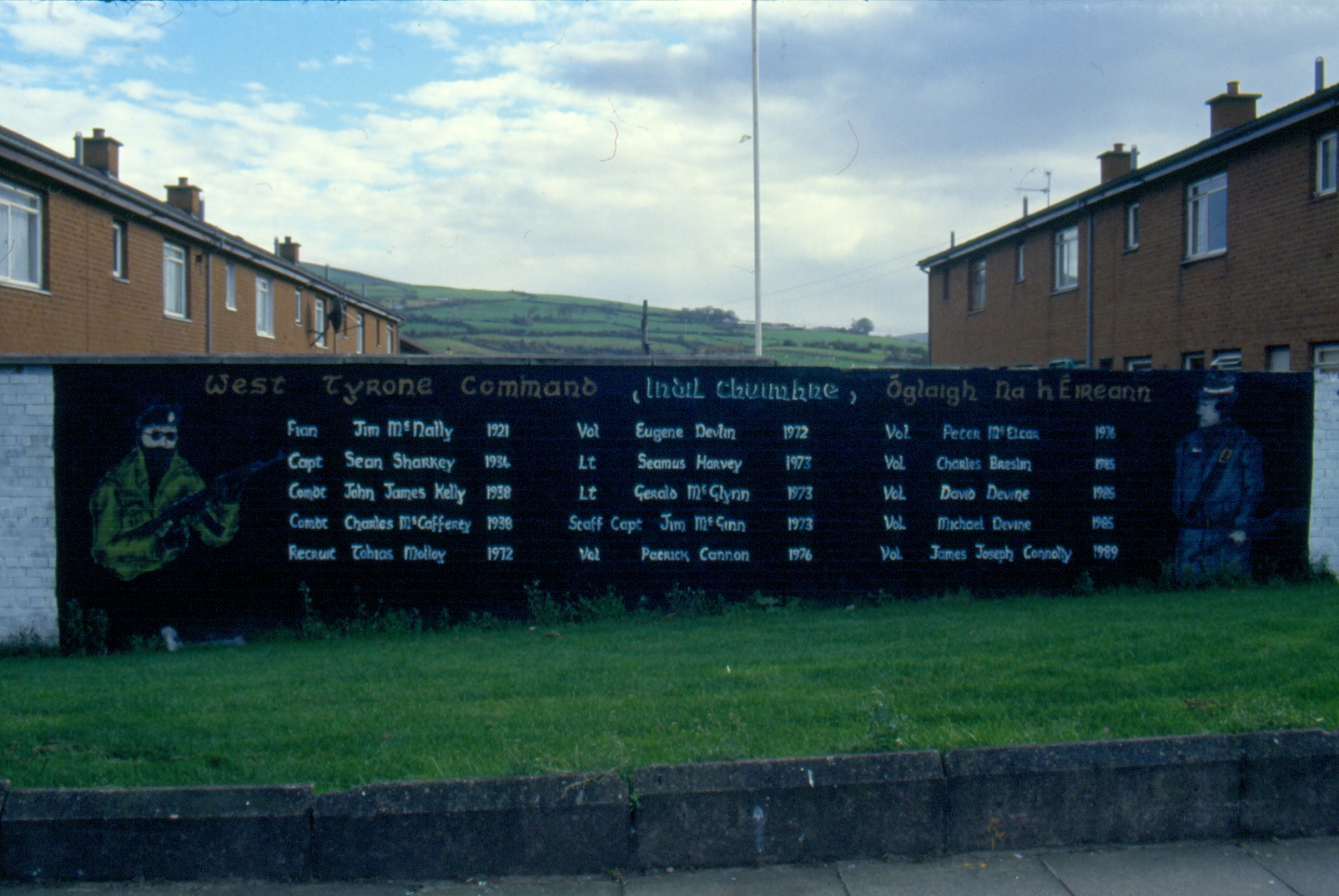 This is an entirely repainted and expanded mural listing the West Tyrone Roll Of Honour. The portrait of Bobby Sands that was originally included in Everyone, Republican Or Otherwise is gone, leaving only the quote from Sands (as shown in the second image). In his place on the right is a volunteer in a hat with a tricoloured band; on the left, the firing party of the previous mural is replaced by a volunteer with AK-47. The names in the roll of honour remain the same though they have been rewritten in a greater space.