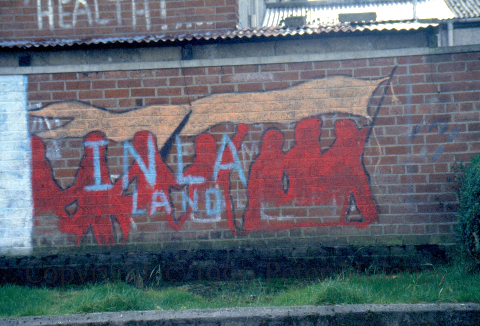 A pair of images from Gartan Drive, Strabane. “Warning to hoods: shotguns can seriously damage your health!” (See peviously: IRA Health Warning). Below that, silhouettes of marching volunteers with a long banner (compare to Armed Struggle in Belfast).