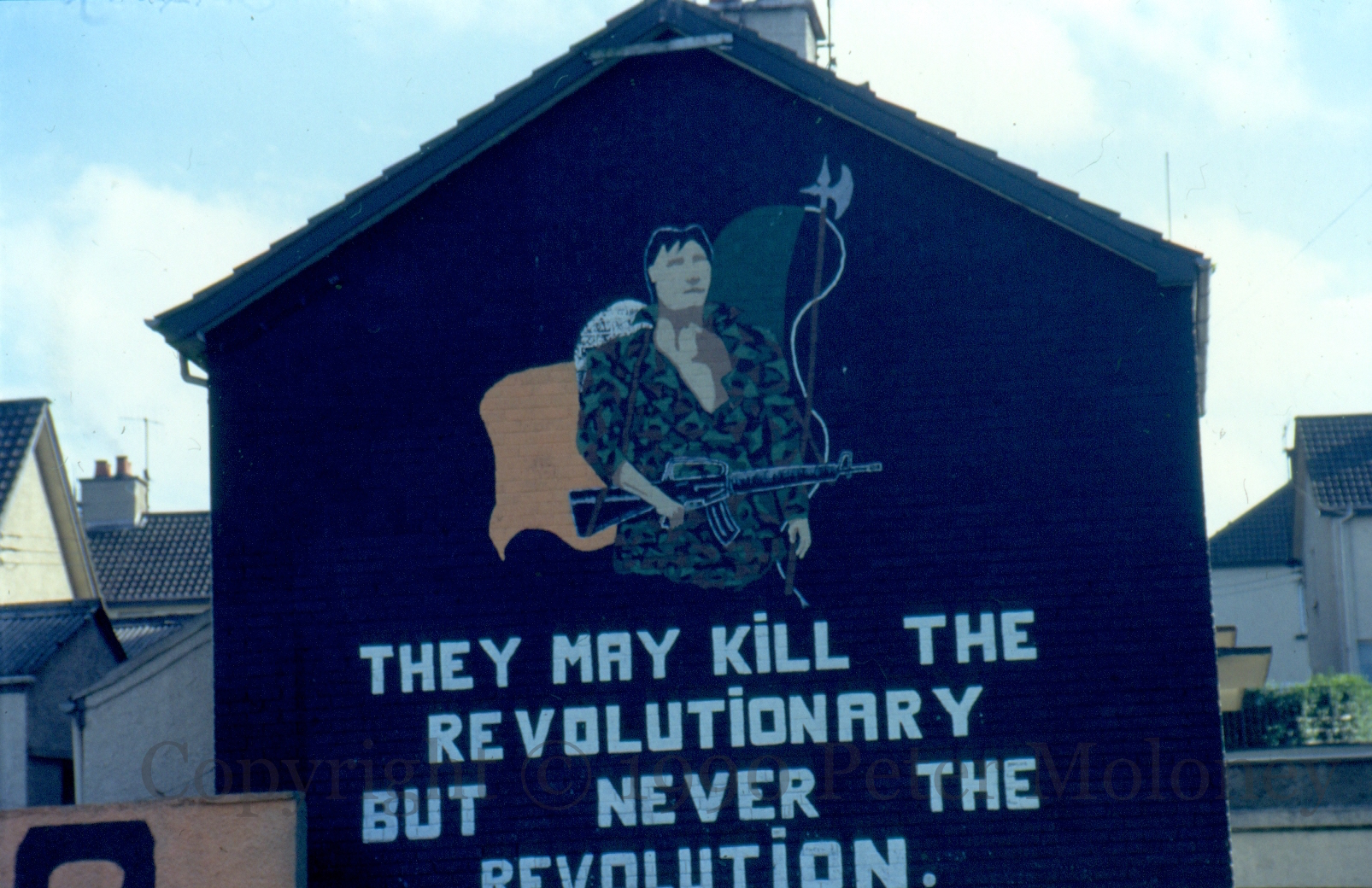 “… but never the revolution”. An early poster is recreated in an IRA mural in Innisfree Gardens, Strabane: a volunteer in fatigues wields an assault rifle. (Seen previously in 1981 in Rockdale St, Belfast and in Derry in 1981.)