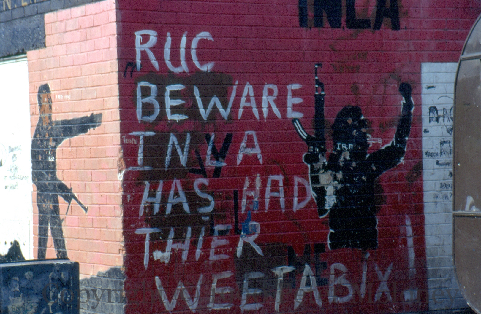 “RUC beware: INLA has had their Weetabix!” Republican parody of a famous 1980s advertising campaign. Ballycolman, Strabane. This is a repurposed wall – see Your Smile Disfigures Us. To the left of shot is (the colour version of) Victory To The INLA.