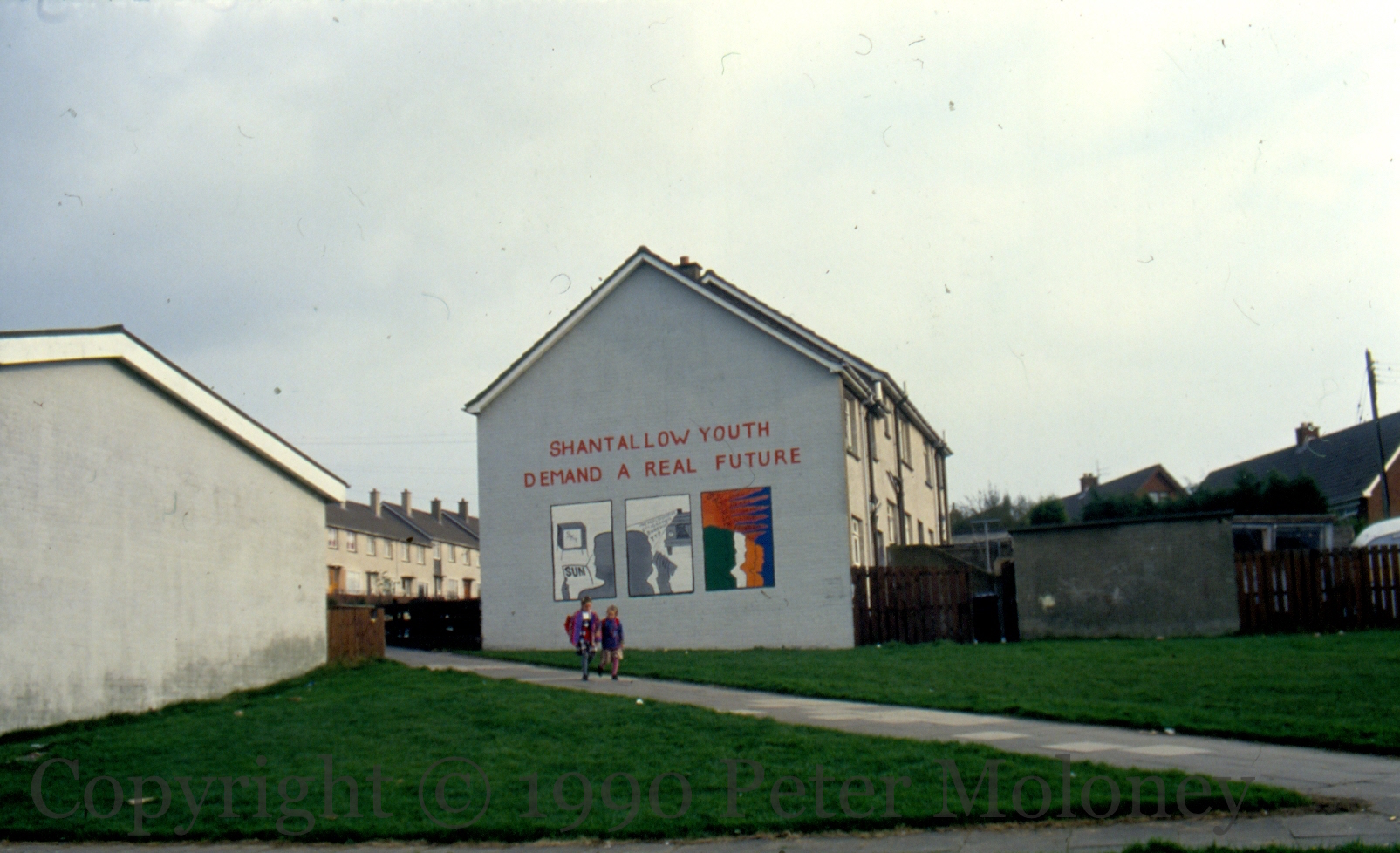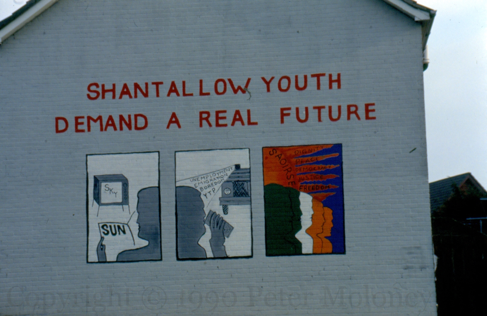Instead of Sky News and the Sun newspaper (panel 1) and an environment of “unemployment, emigration, boredom, YTP [youth training programmes]” (panel 2), Shantallow youth want a future of “Saoırse, dignity, peace, democracy, justice, freedom” (panel 3). The figures are in the colours of the Irish Tricolour and a sunburst forms a backdrop. Moyola Drive, Derry