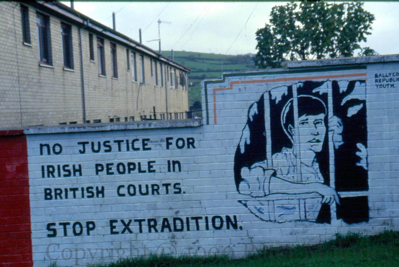 1990 image of Stop Extradition. “No justice for Irish people in British courts – stop extradition.” Ballycolman, Strabane