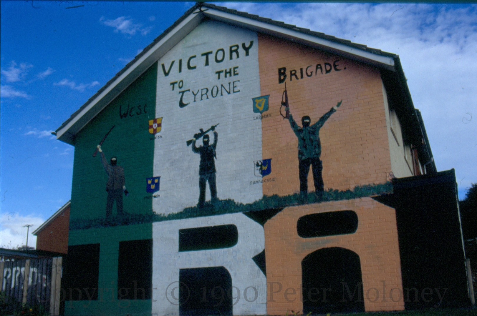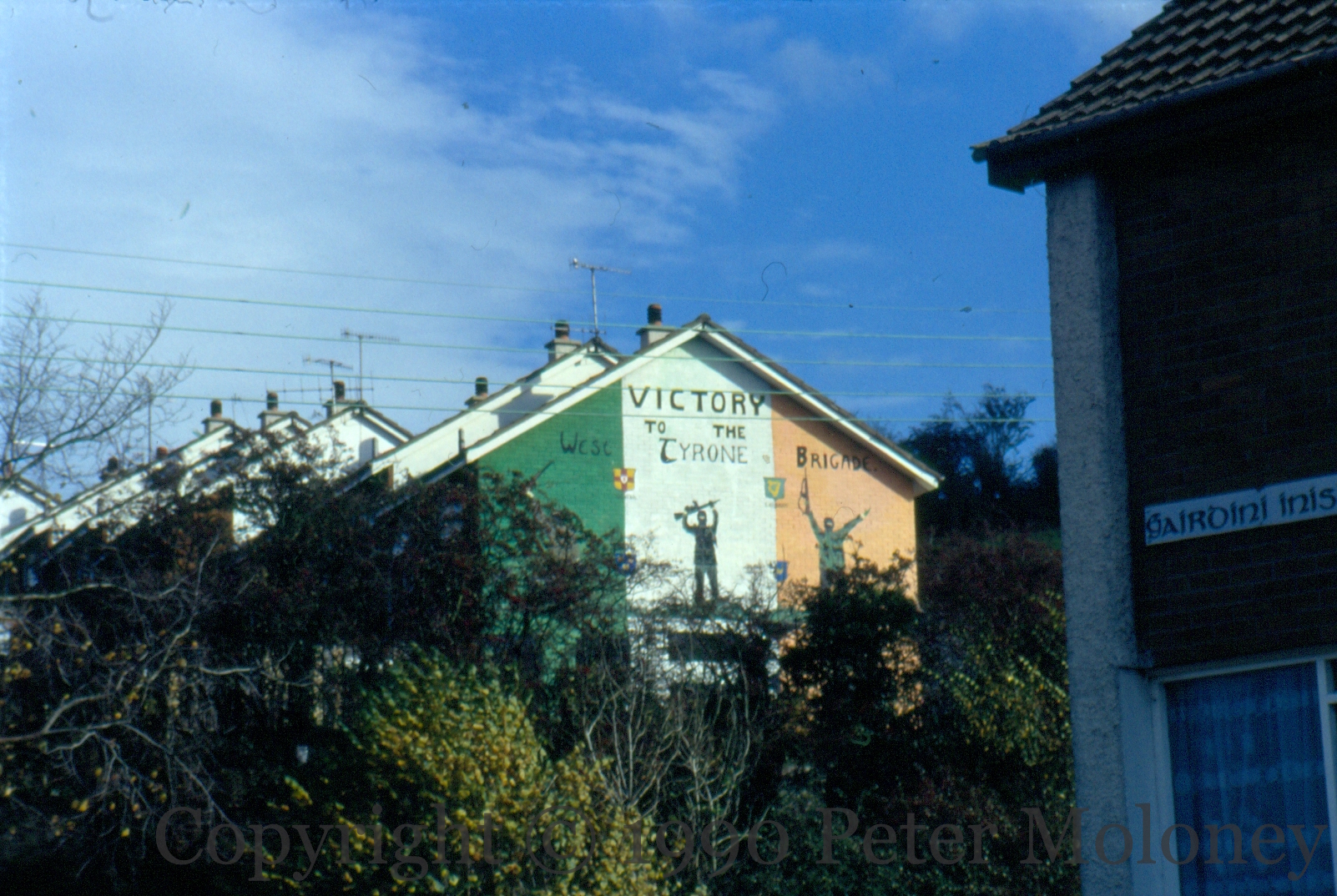Two 1990 images of Victory To The West Tyrone Brigade in Springhill Park, one from below in Innisfree Gardens, Strabane.
