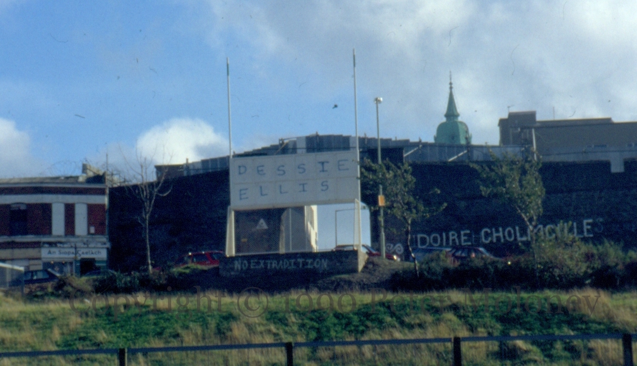 “Dessie Ellis – No extradition” (and “Doire Cholmcoille”). This is the reverse of the Rossville Flats Demolition Art piece on Fahan Street, Derry.